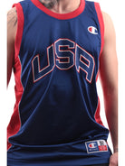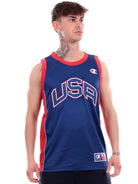 Canotta Champion blu da uomo USA Tank 21974, realizzata in morbido tessuto. Questa canotta Champion blu e rossa è caratterizzata dalla maxi stampa USA sul davanti e dai fori traspiranti laterali.