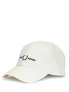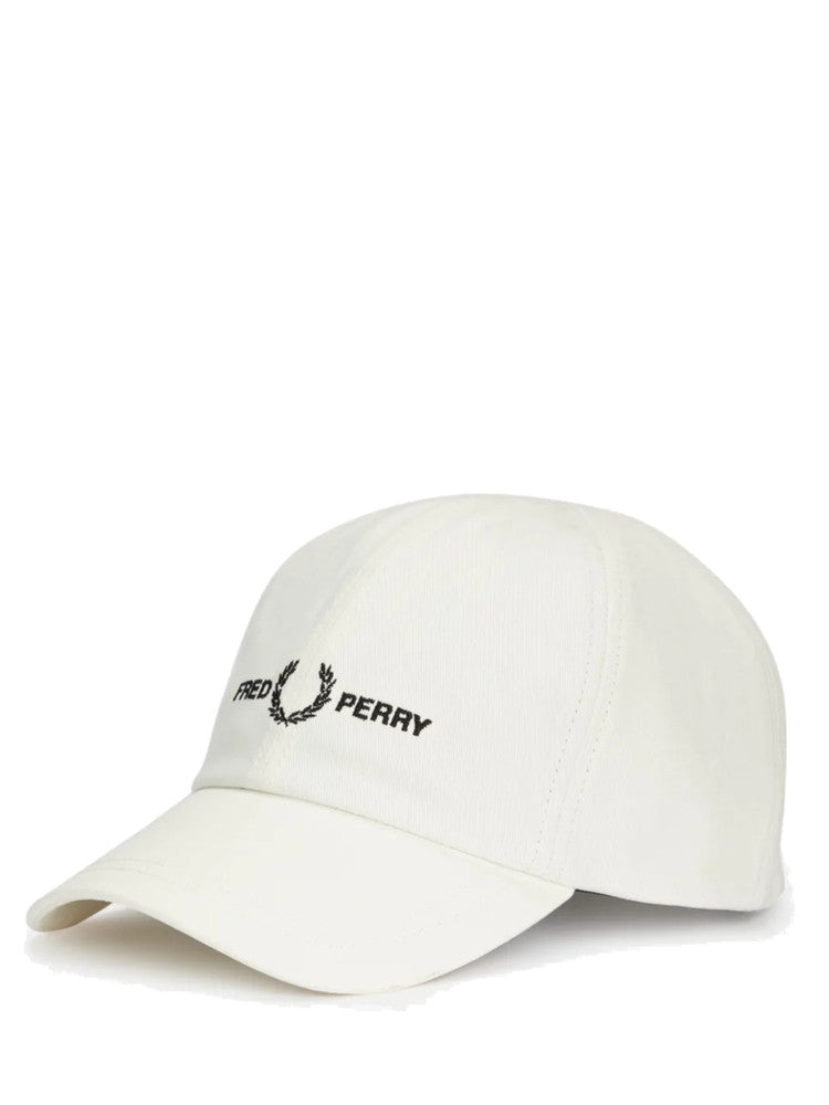 Cappello Fred Perry bianco con stampa logo, modello HW4630, realizzato in 100% puro cotone. Questo berretto Fred Perry bianco ha la visiera rigida, l'interno realizzato in tessuto traspirante, la chiusura posteriore con gancetto e il logo del brand sul davanti a contrasto colore.