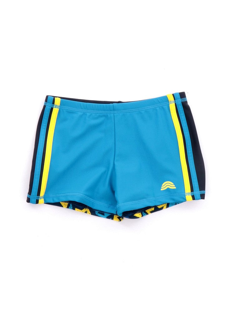 Costume short Aquarapid da bambino celeste con doppia striscia laterale colorata e fantasia posteriore. Questo costume da bambino Aquarapid ha il logo stampato lato sinistro e dei comodi laccetti checonsentono di regolare la fascia elastica che si trova sul punto vita. La composizione di questo short Aquarapid in materiale tecnico e ultra leggero gli consente di risultare molto morbido a contatto con la pelle, sia dentro che fuori dall'acqua, e di tornare asciutto nel giro di pochi minuti