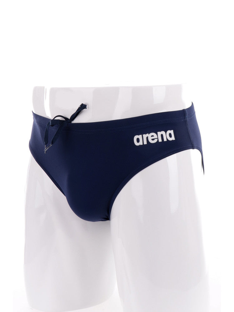 Costume slip Arena blu da uomo. Questo costume da uomo Arena studiato per svolgere tutte le attività da piscina si serve della tecnologia MaxLife che lo rende estremamente durabile, molto resistenteal cloro e gli garantisce un'asciugatura veloce. Questo costume slip Arena blu ha una stampa posteriore con la scritta Arena bianca a contrasto e dei laccetti per regolare la fascia elastica posta sul punto vita