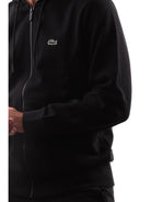 Felpa Lacoste nera da uomo SH9626. Questa felpa Lacoste ha la chiusura full zip, due tasche laterali aperte, il cappuccio regolabile con laccetti, polsini e fondo a costine. L'iconico coccodrillo è posizionato sul cuore della felpa Lacoste.