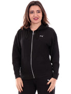 Felpa Puma nera da donna 677882, realizzato in tessuto morbido. Questa felpa Puma con cappuccio regolabile con laccetti è decorata a nido d'ape, ha la chiusura centrale full zip, ha due tasche apertelaterali, i polsini elasticizzati e la banda elastica alla base.