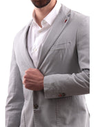 Giacca elegante uomo Mulish grigio perla BOLR7200, realizzata in misto lino. Questa giacca Mulish grigia ha il colletto arricchito dall'iconico corno rosso, la chiusura con doppio bottone, due taschefrontali aperte, un taschino lato cuore e il fondo con spacchi laterali.