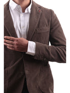 Giacca Mulish marrone da uomo Demetr DEMETRAR7002, realizzata in velluto. Questa giacca elegante Mulish marrone ha il colletto tradizionale con l'iconico corno rosso, la chiusura con doppio bottone, un taschino aperto a filo, due tasche laterali con patta e le maniche lunghe con bottoni.