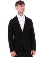 Giacca Mulish nera da uomo Nido D'Ape CHOGKS900, realizzata in tessuto morbido e leggero, perfetta per l'estate. Questa giacca elegante Mulish ha il colletto francese, la chiusura con bottoni, due tasche laterali con patta, un taschino lato cuore e il corno rosso a contrasto colore.