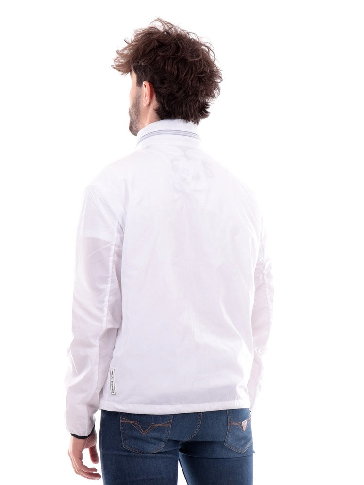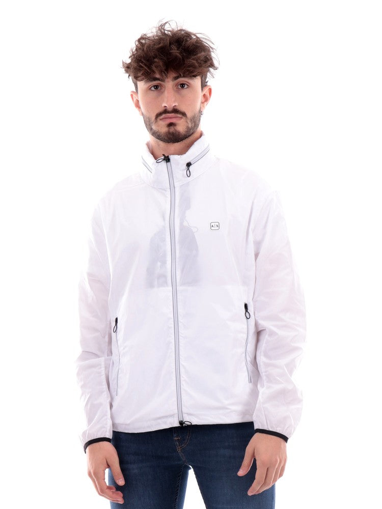 Giubbino Armani Exchange bianco da uomo, modello Blouson 8NZB07ZNWFZ, realizzato in morbido tessuto a tinta unita. Questa giacca AX bianca ha il cappuccio estraible regolabile con coulisse, lo scaldacollo, la chiusura full zip centrale con doppio cursore, due tasche laterali con zip e il fondo regolabile con coulisse. Patch gommato sul cuore.