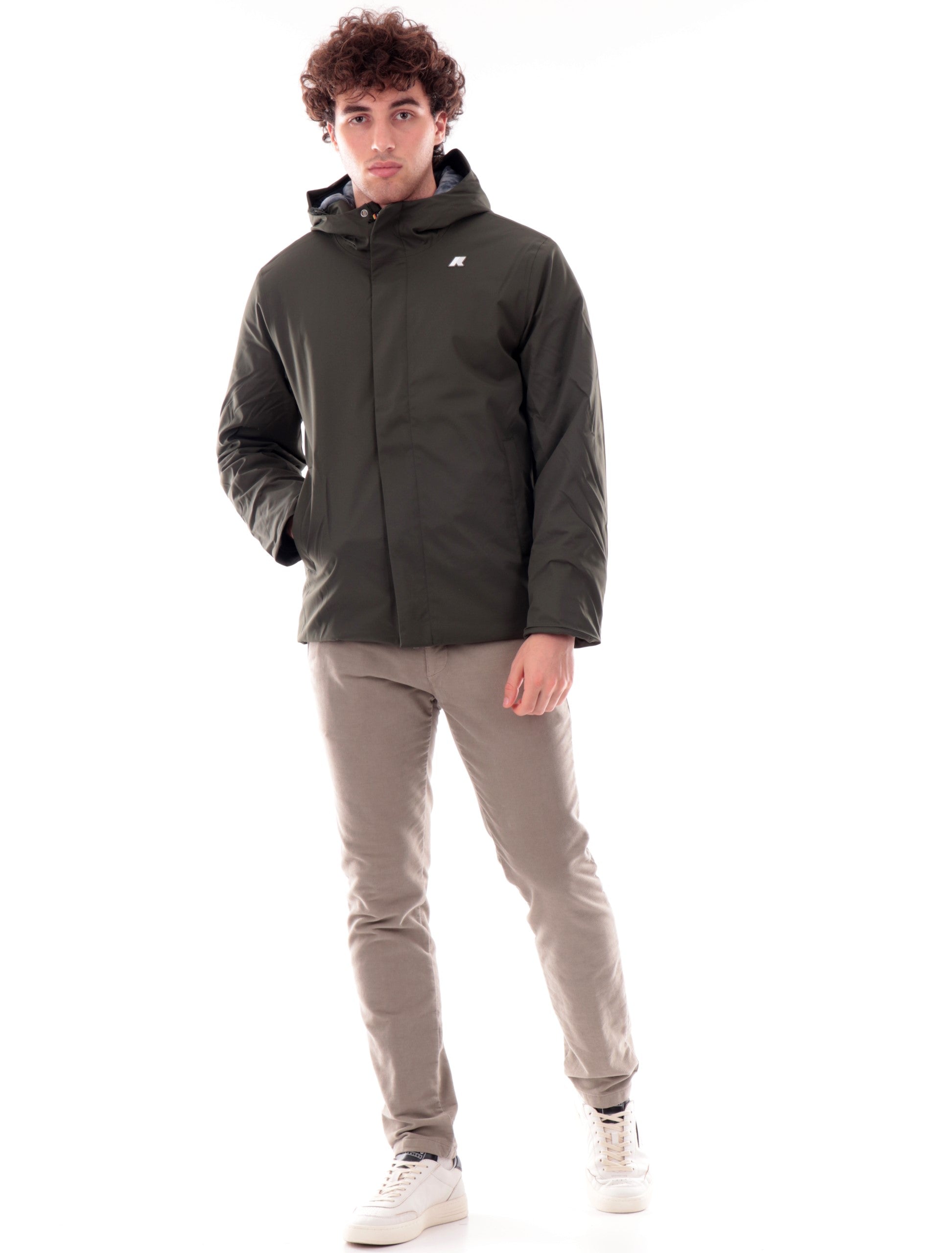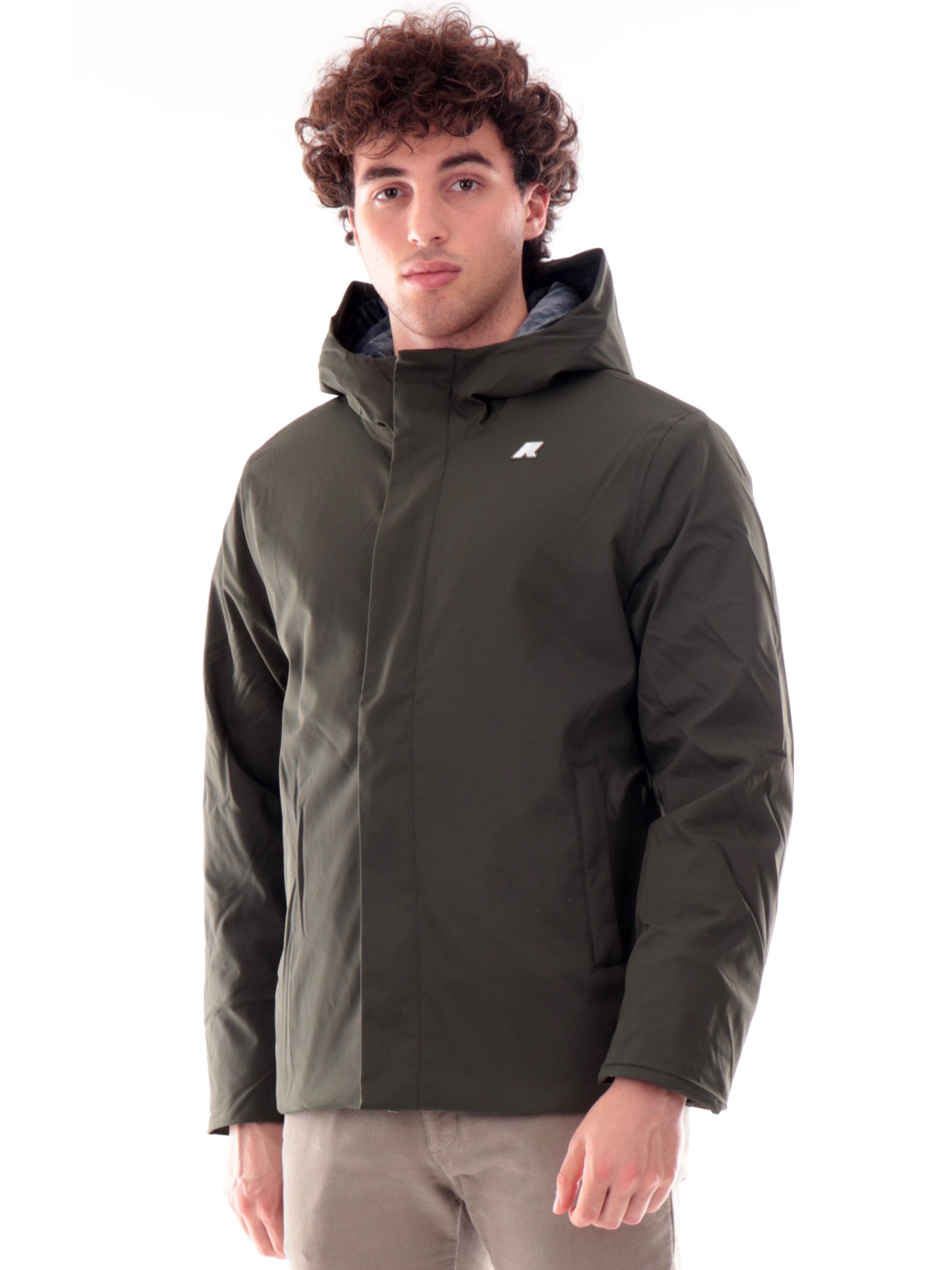 Giubbino K-Way verde da uomo JACK TWILL MARMOTTA. Questo giubbino K-Way verde da uomo è realizzato da un tessuto impermeabile resistente all'acqua e antivento, al suo interno troviamo un imbottitura calda, morbida al tatto perfetto per l'inverno. Questo giubotto K-Way è caratterizzato da un cappuccio fisso, chiusura con zip nascosta da una patta a bottonoi, due tasche laterali con zip, polsini e fondo regolare con coulisse. Questo giubotto è perfetto per un look casual
