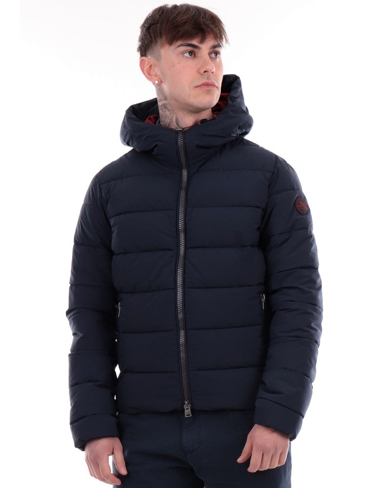 Giubbino Museum blu da uomo Justin JA05PL966, realizzato in morbido tessuto a tinta unita con interno rosso. Questo giubbotto Musuem blu ha il cappuccio fisso regolabile con coulisse, la chiusura full zip centrale, due tasche laterali con zip e il patch del brand sulla manica sinistra a contrasto colore.