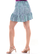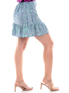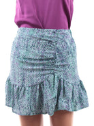 Gonna Molly Bracken celeste da donna con fondo ampio, modello LAL299BP, realizzata in tessuto morbido ed elastico. Questa gonna Molly Bracken celeste ha la banda elastica sul punto vita, il fondo ampio e la fantasia foulard all over a contrasto colore.
