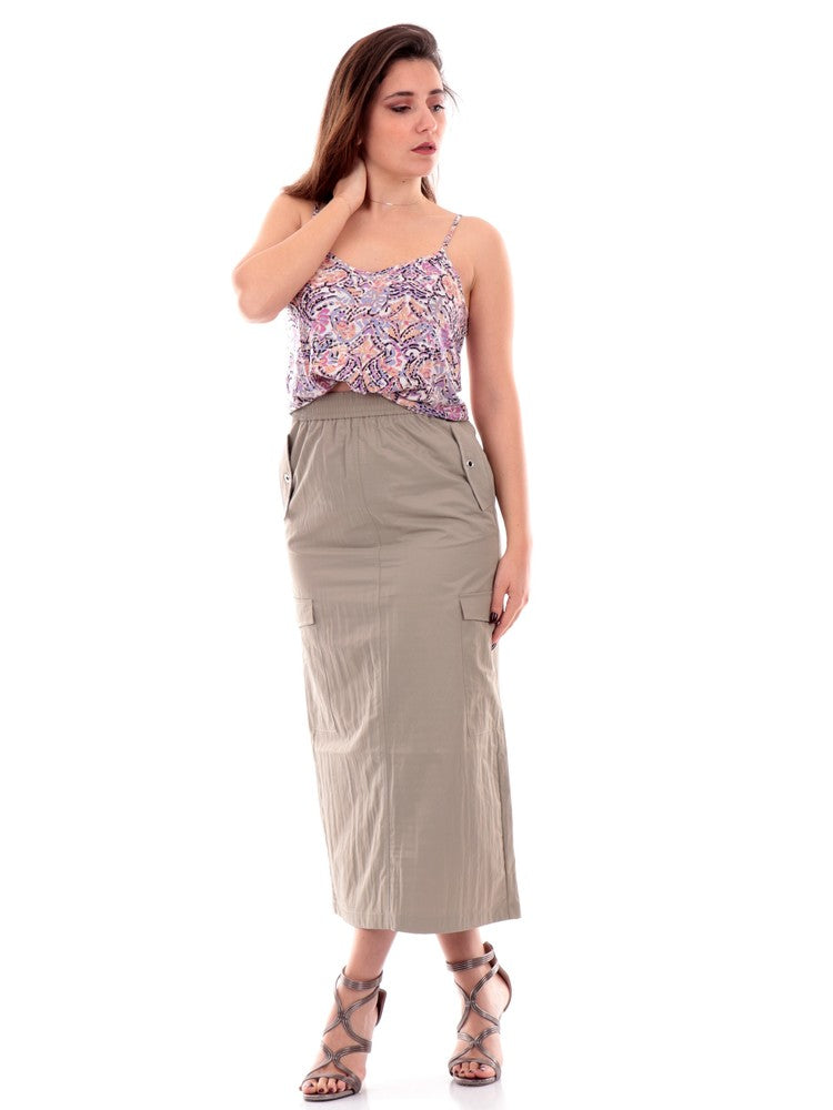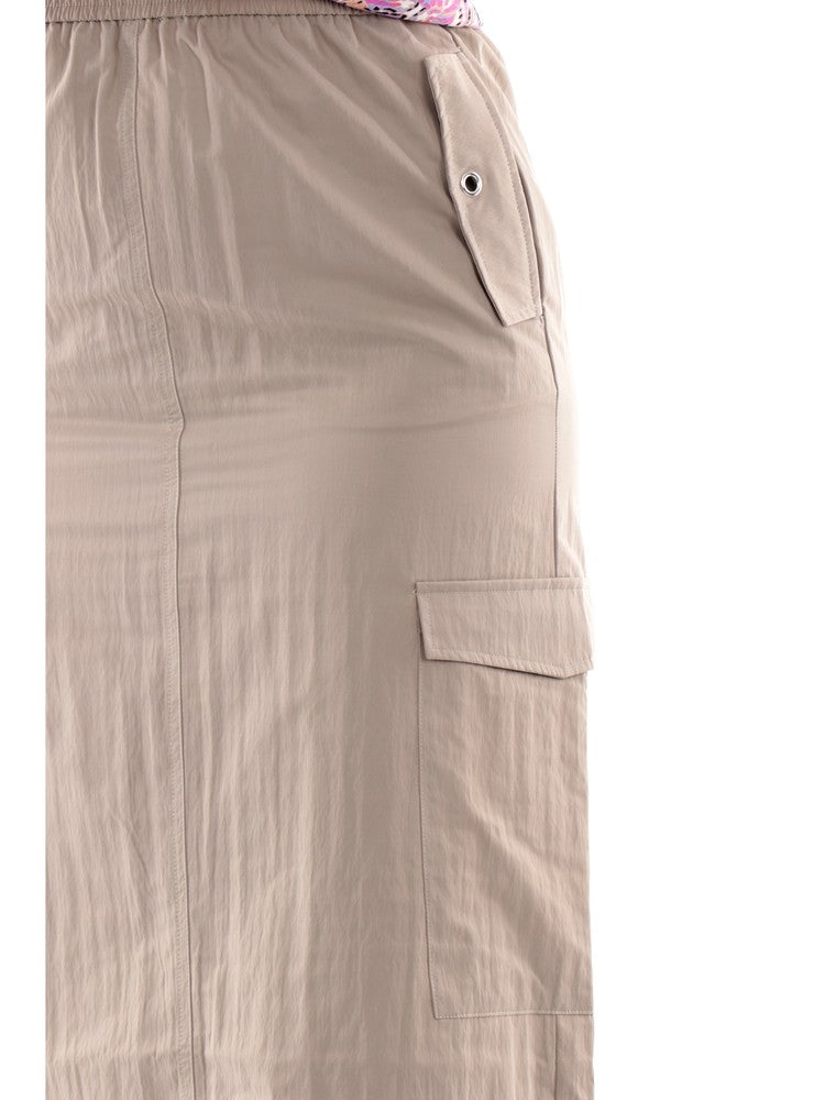 Gonna cargo Only beige da donna 15318638 realizzata in tessuto leggero. Questa gonna Only è caratterizzata da uno spacco posteriore e da tasche aperte sia laterali che frontali.