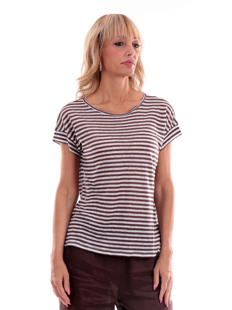 T-shirt Anis da donna, girocollo realizzata in puro lino. Il modello presenta fantasia a righe orizzontali marroni su fondo bianco. La vestibilità leggermente ampia, con maniche corte a giro, sottolinea l'appeal moderno e casual di questa maglietta Anis da donna, ideale per il tempo libero.