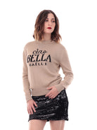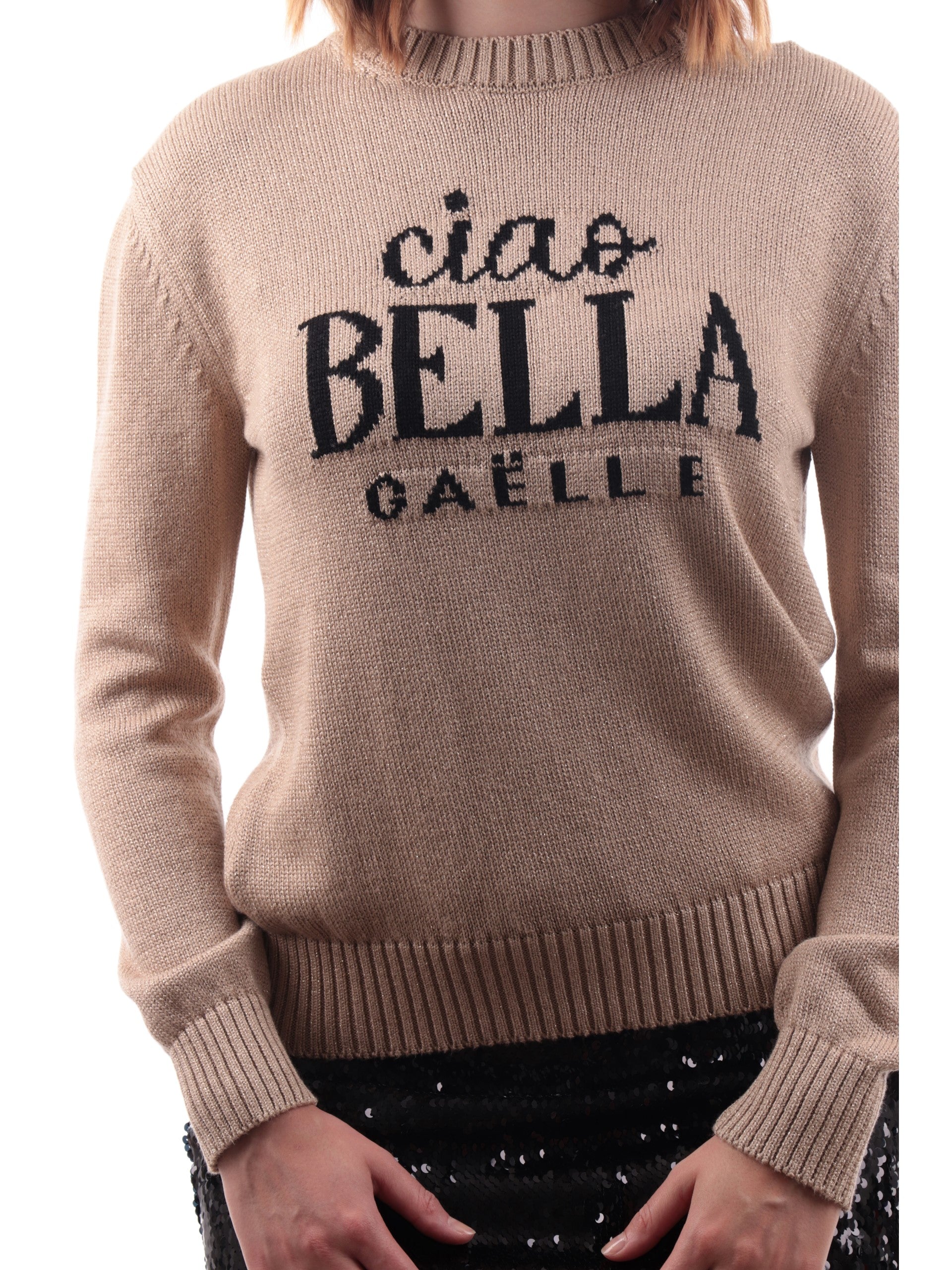 Maglia Gaelle da donna girocollo realizzata in filato di mista viscosa tinta unita, impreziosito da una lavorazione a nido d'ape e bordi rifiniti a costine. Gli interventi in lurex donano luminosità a questo maglione da donna dal design classico, mentre le maniche lunghe a giro leggermente basso completano lo stile del modello GBDMMML10709. Pullover rifinito con lettering "Ciao bella" seguitodalla scritta-logo Gaelle, ricamati frontalemente in tonalità a contrasto.