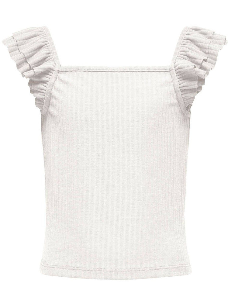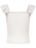 Maglia Only bianca da bambina Frill Strap 15317829, realizzata in morbido tessuto a costine. Questo top Only bianco ha le maniche a sbuffo, la vestibilità crop e il fondo regolare.