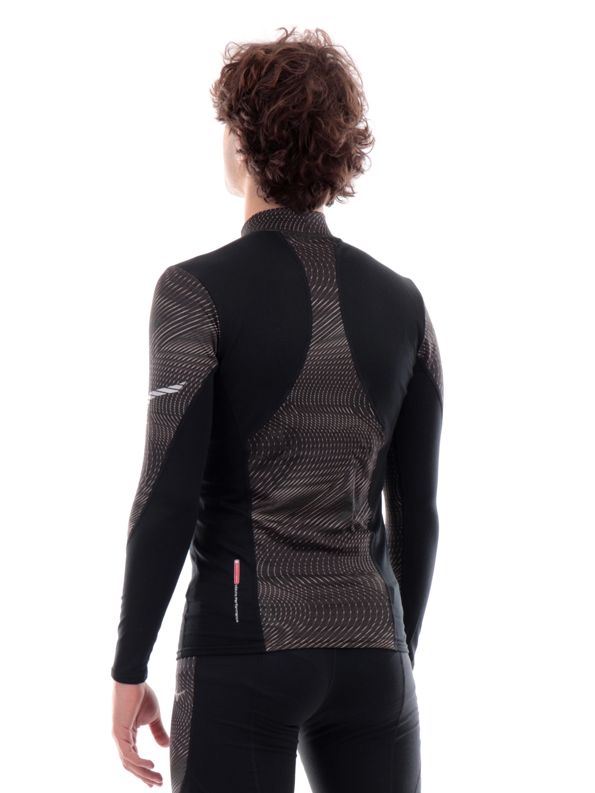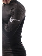 Maglia termica Mizuno grigia da uomo Virtual Body G3 High Neck A2GA1510. Questa maglietta termica Mizuno nera a collo alto con fantasia Virtual all over ha le maniche lunghe, il fondo regolare e la stampa logo applicata sia sul davanti lato destro che sulla manica sinistra.