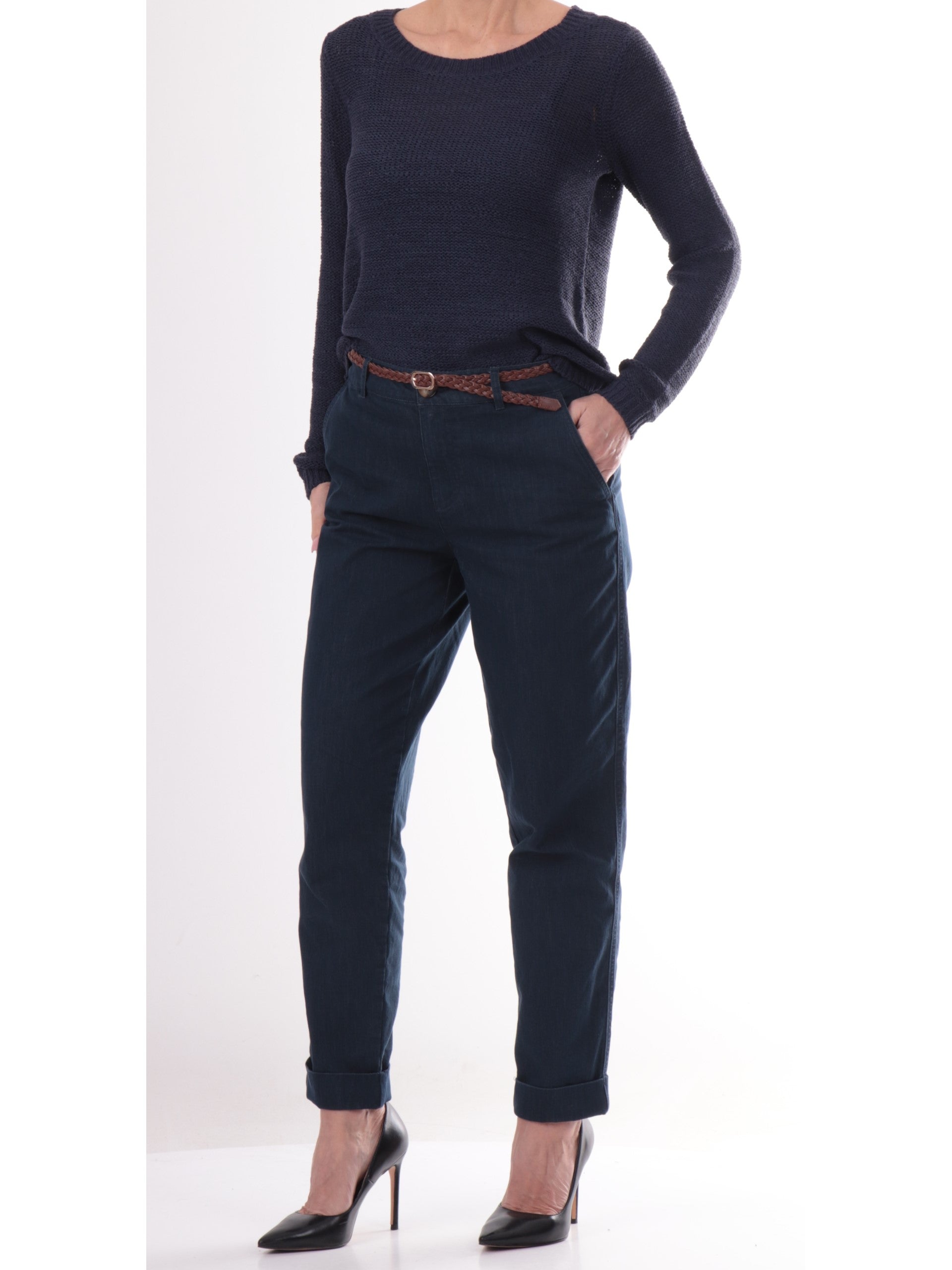 Maglione blu da donna Only. Questo maglione blu, realizzato da un tessuto morbido e leggero, perfetto pre la primavera, è caratterizzato dallo scollo a giro, maniche lunghe, trama intrecciata, polsini e fondo elasticizzate