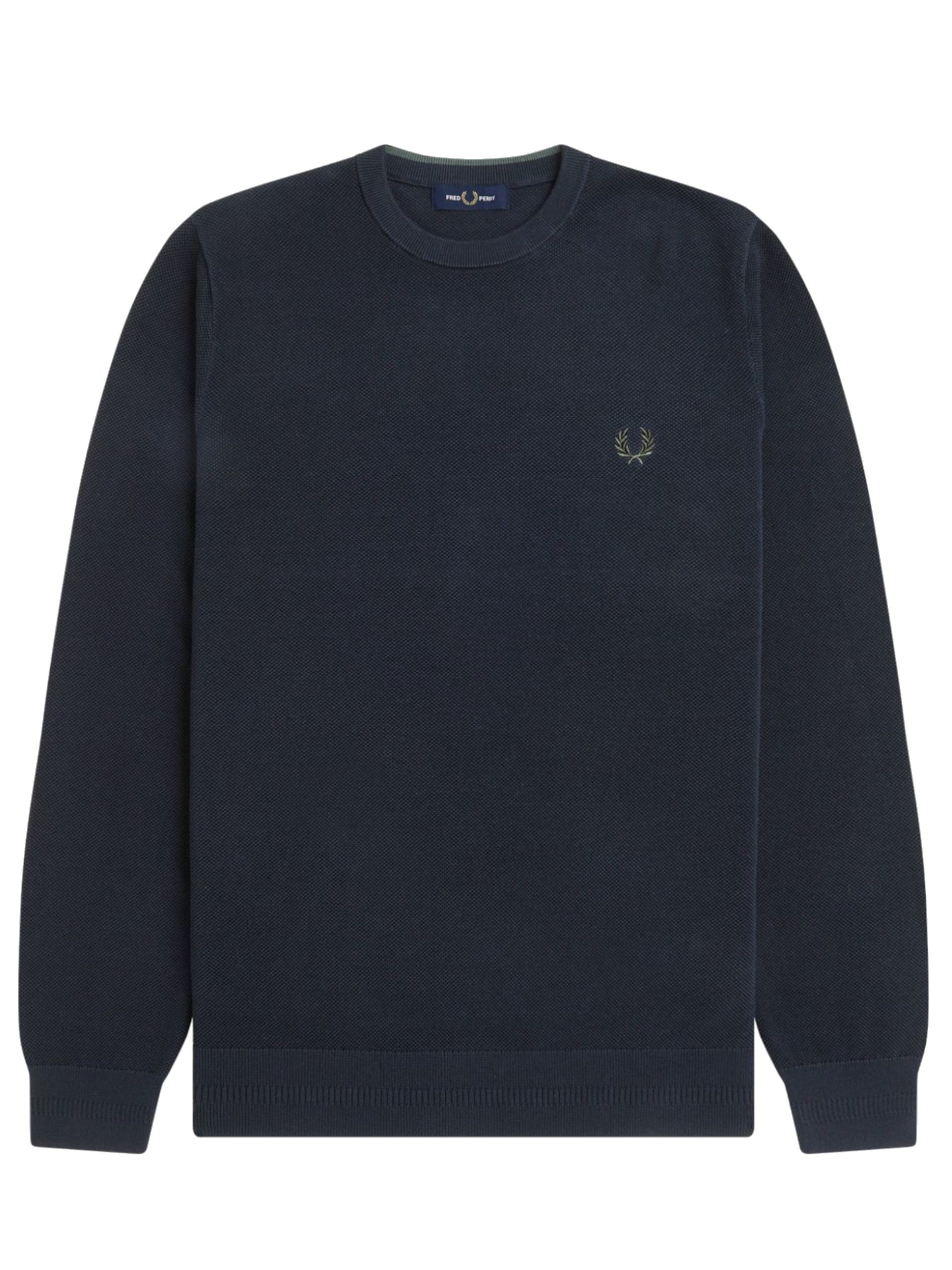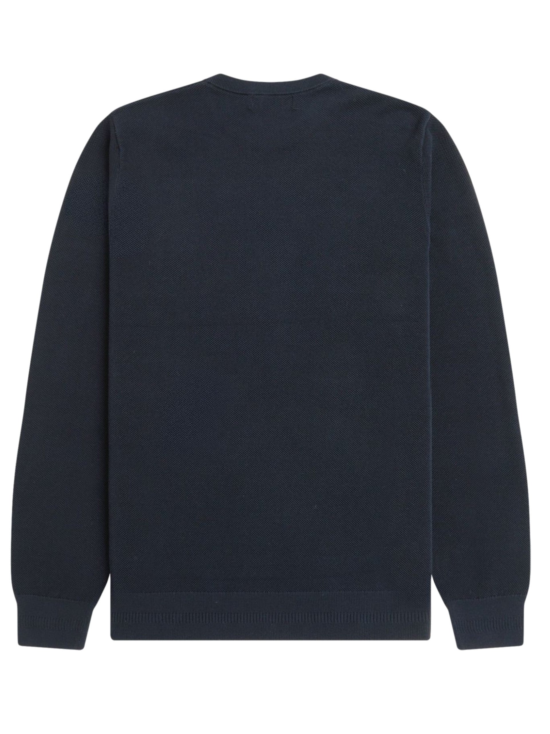 Maglione Fred Perry blu nido d'ape da uomo girocollo Pique Stitch, realizzato in 100% puro cotone. Questo maglione uomo Fred Perry blu girocollo ha le maniche lunghe, il logo Fred Perry ricamato latocuore, polsini e fondo elasticizzati.