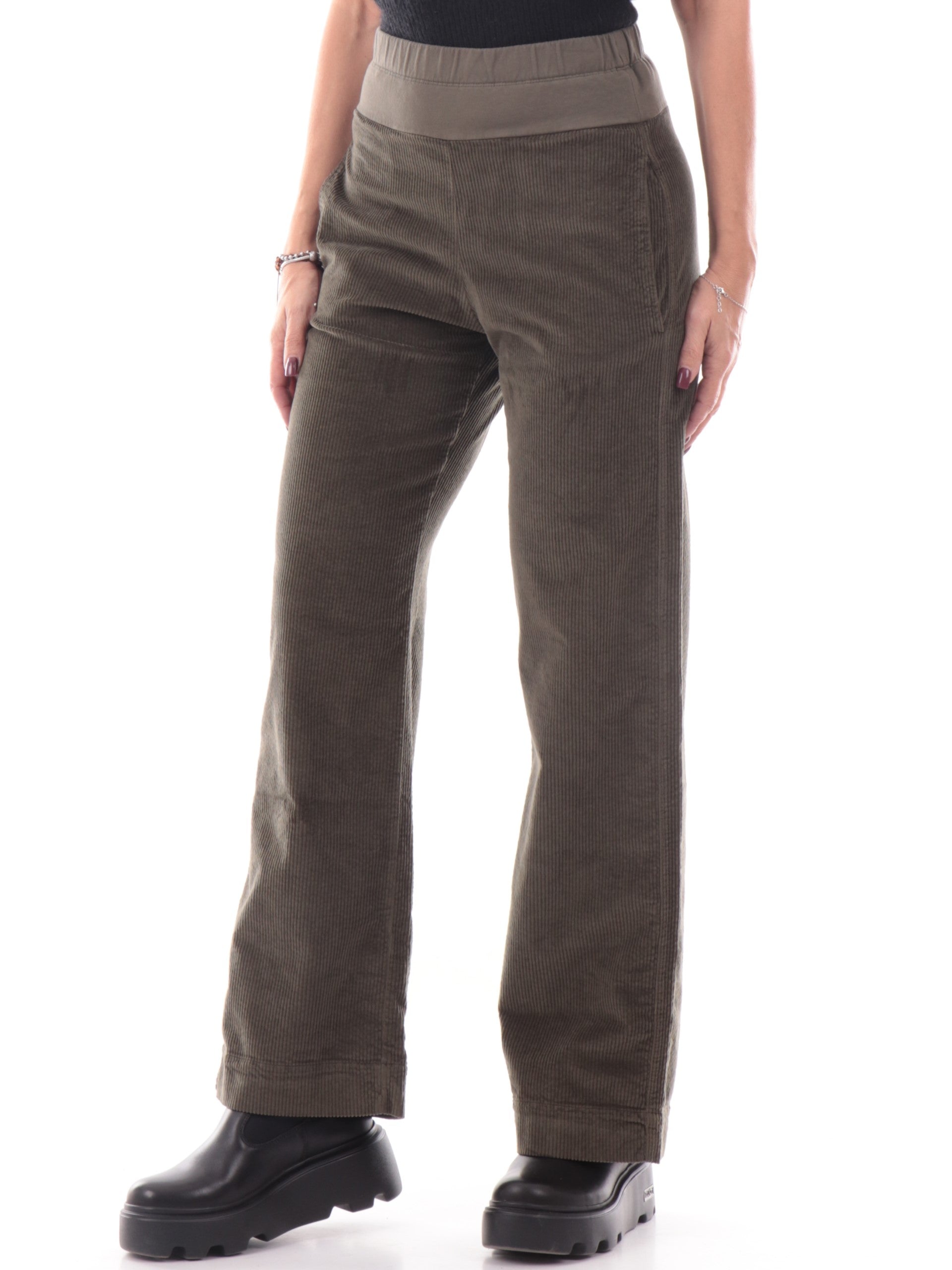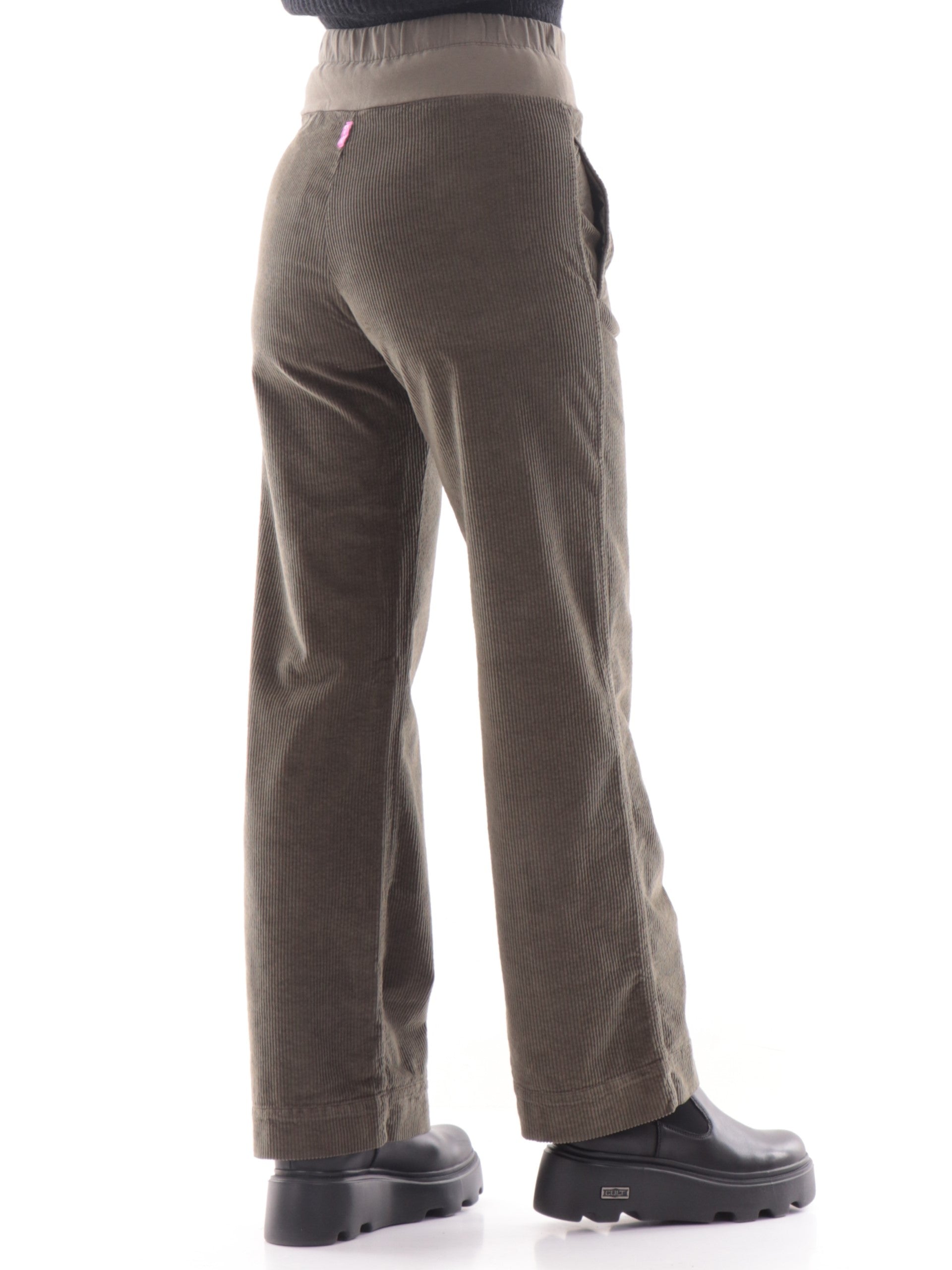 Pantaloni in velluto verdi Deha da donna a gamba larga. Questi pantaloni verdi Deha a gamba larga sono realizzati in cotone e hanno la banda elastica sul punto vita, due tasche laterali aperte e il fondo largo. Questi pantaloni Deha verdi da donna offrono un sostegno leggero e confortevole