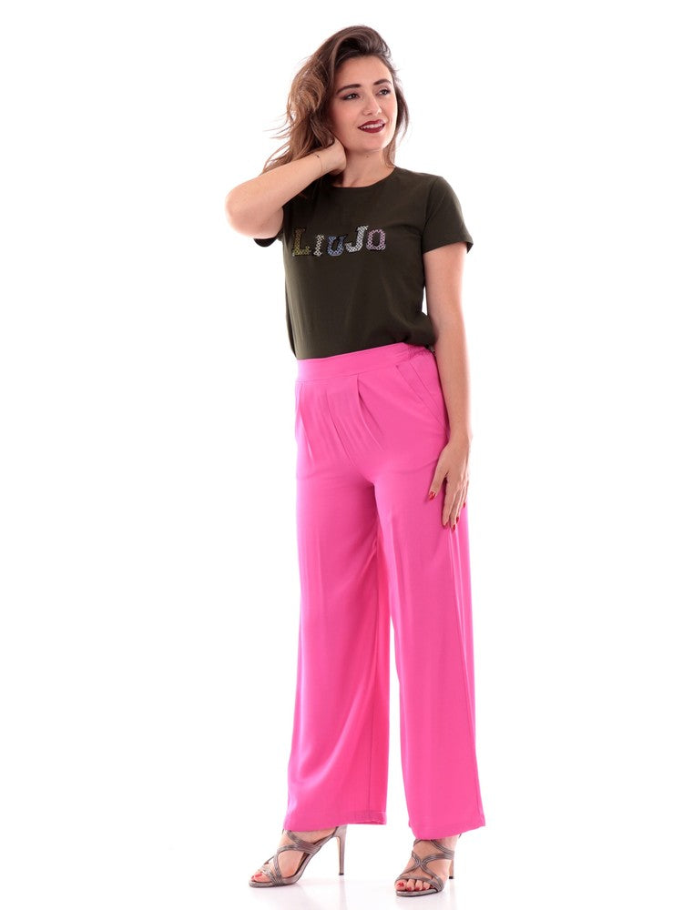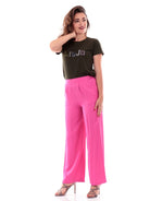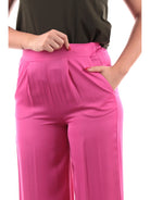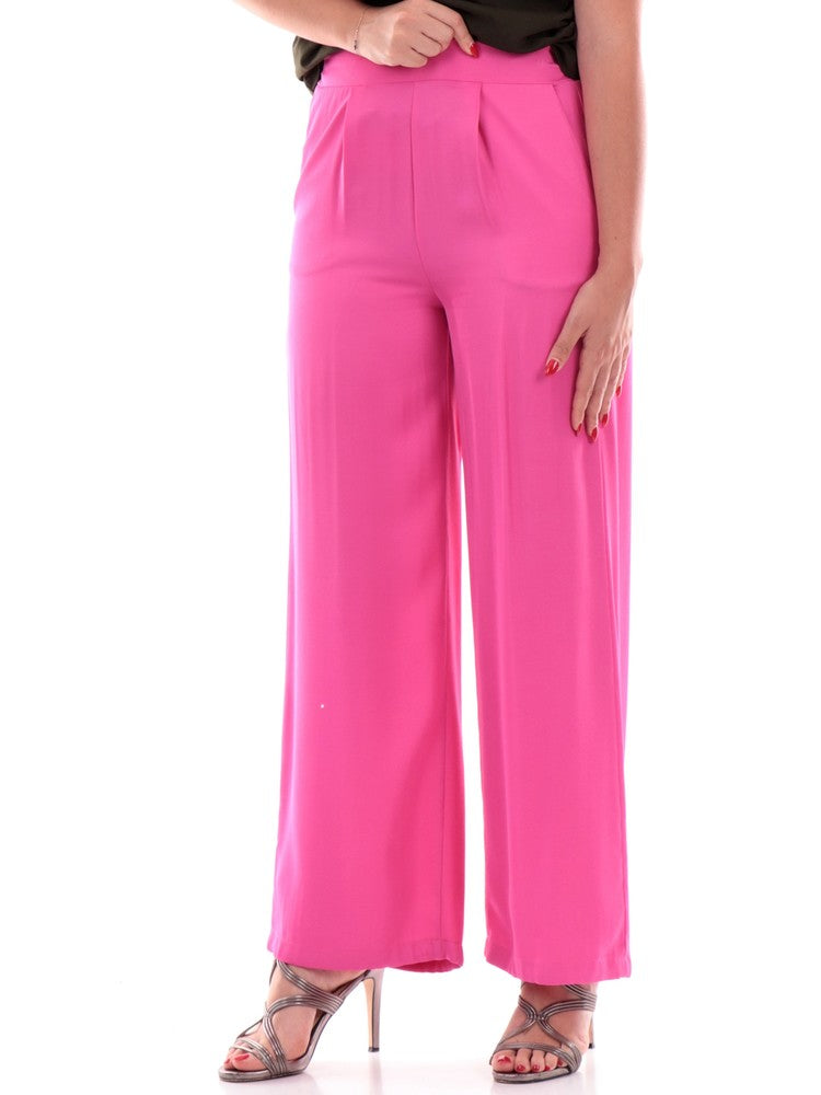Pantaloni palazzo Wu'Side fucsia da donna 23797, realizzati in 100% viscosa. Questo pantalone Wu Side fuxia ha la banda elastica sul punto vita, due tasche laterali aperte con taglio obliquo e il fondo a zampa.