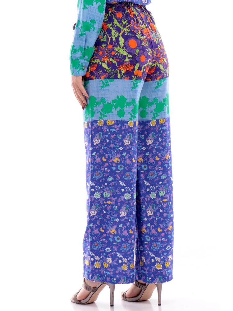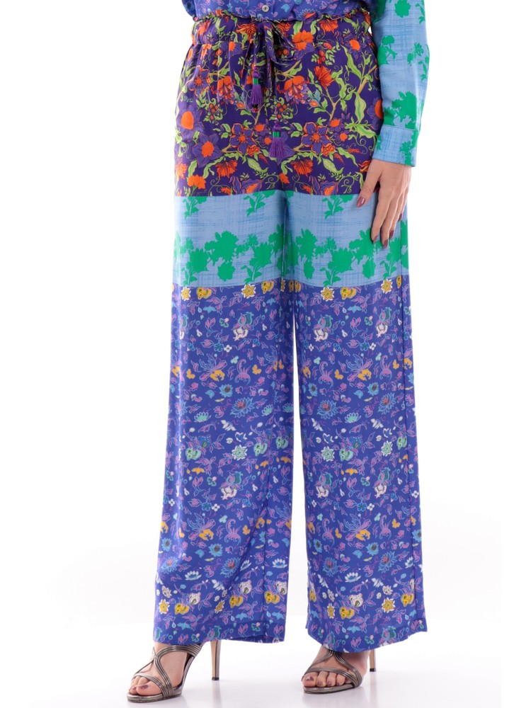 Pantaloni palazzo Wu'Side viola da donna multifantasia 23701, realizzati in morbida viscosa. Questo pantalone Wu Side viola ha la banda elastica sul punto vita regolabile con laccetti, due tasche laterali aperte con taglio obliquo e il fondo a zampa.