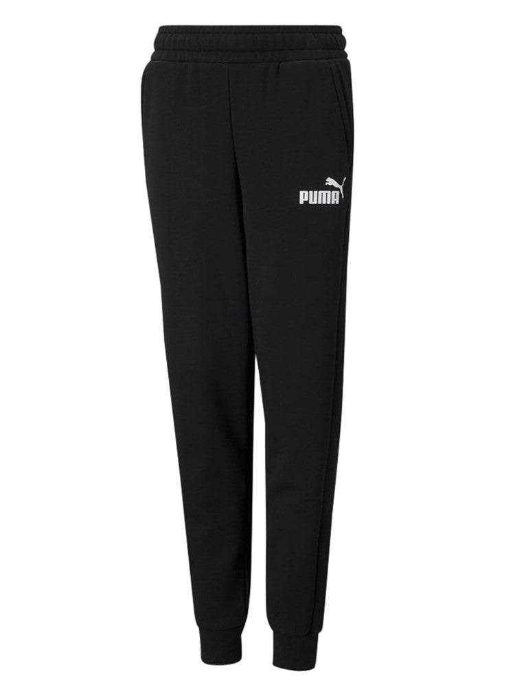 Pantaloni tuta Puma neri da bambino con logo, 58697, realizzati in 100% puro cotone. Questi pantaloni Puma neri hanno la banda elastica sul punto vita regolabile con laccetti, due tasche laterali aperte, il logo del brand sul lato sinistro a contrasto colore e i polsini elasticizzati a costine.