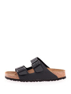 Sandali Birkenstock neri Arizona 051793. Questi sandali Birkenstock neri hanno la tomaia in nubuk con doppio cinturino regolabile con fibbia metallica, la soletta ergonomica in sughero per il miglioralloggio del piede e la suola in EVA per la più elevata sensazione di comfort.