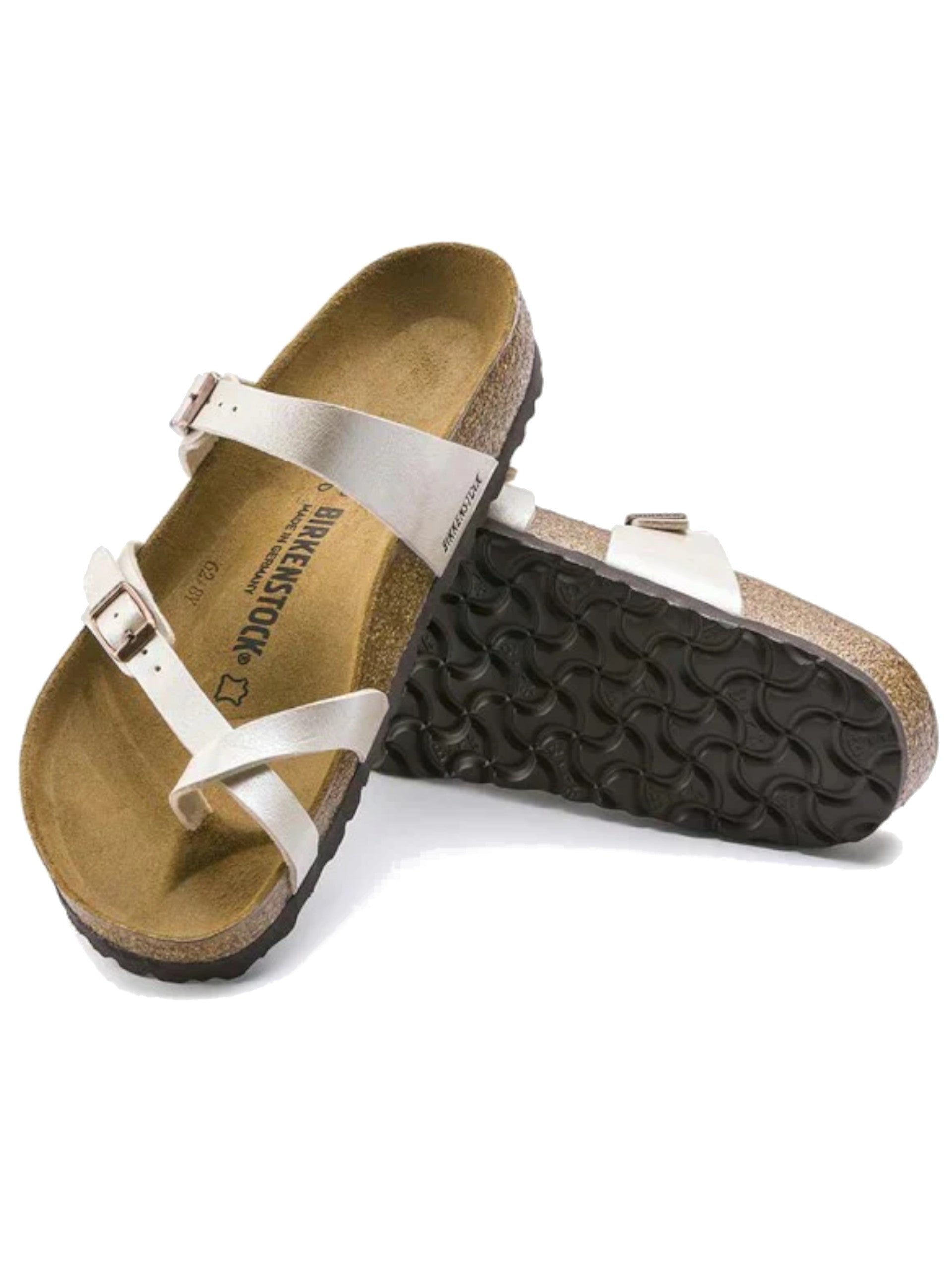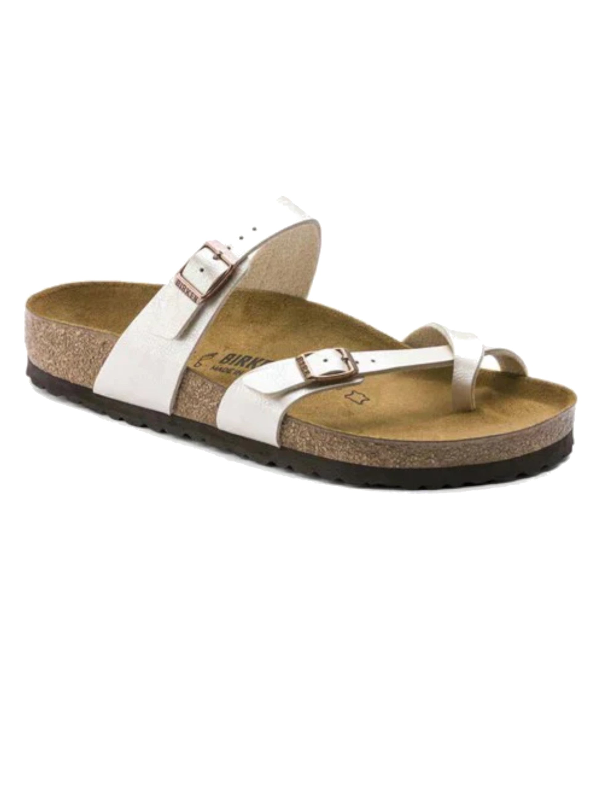 Sandalo dalle linee sobrie e minimaliste; classico di casa Birkenstock per il suo design intramontabile, il modello Mayari ha due cinturini con fibbia di metallo regolabile realizzati in Birko-Flor®,rifinito in pelle per un comfort ideale. Punto di forza dei sandali Birkenstock è la forma anatomica del plantare, realizzato in sughero che isola dal caldo, mentre la suola in EVA, leggera edelastica, ammortizza dolcemente i passi durante la camminata.