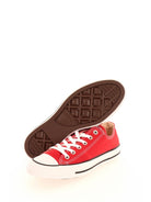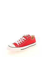 Scarpa Converse da uomo e da donna bassa in tessuto di colore rosso. Iconica sneaker del brand, prende ispirazione dal mondo basket degli anni'70, diventando oggi una delle scarpe piu famose e vendute nel settore della moda. Questo particolare modello "basso" è realizzato in tela con lacci in cotone, interno foderato in tessuto, occhielli in metallo rinforzato, punta e suola in gomma.