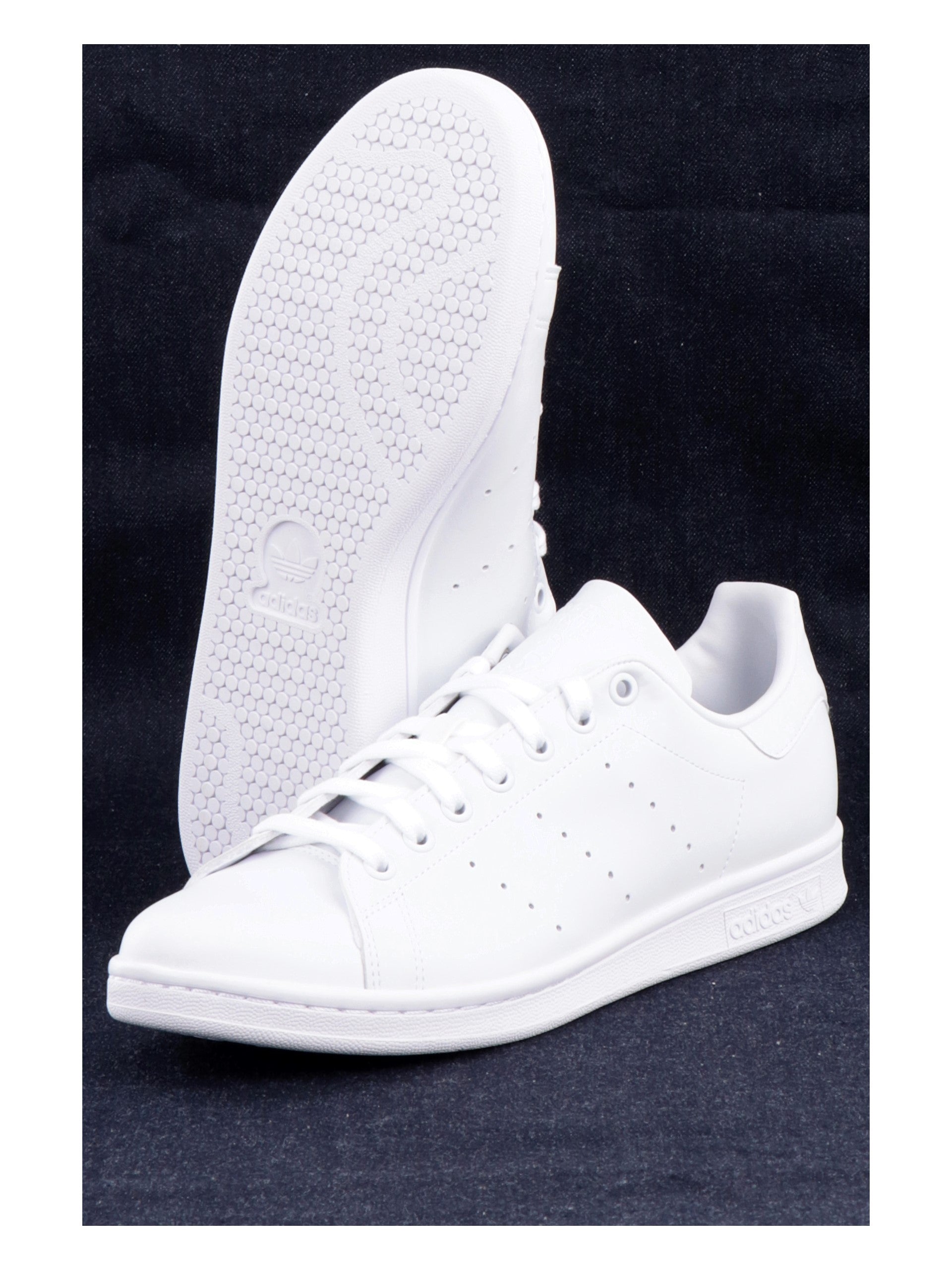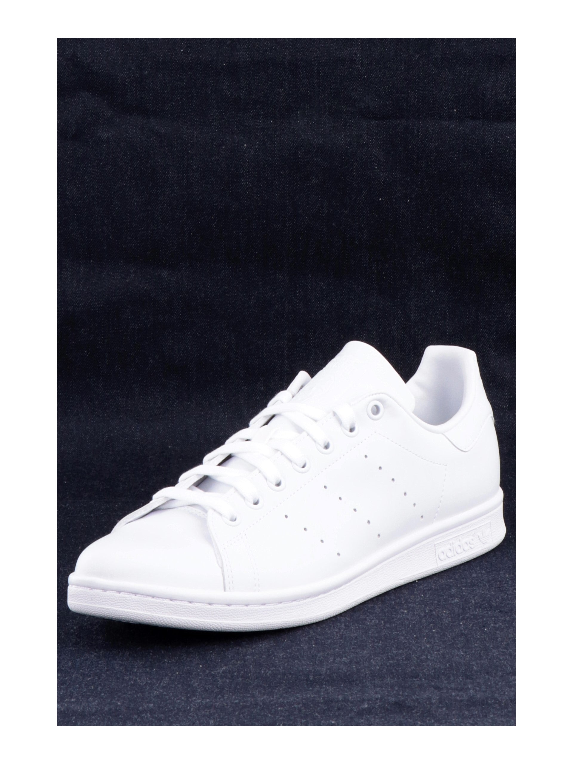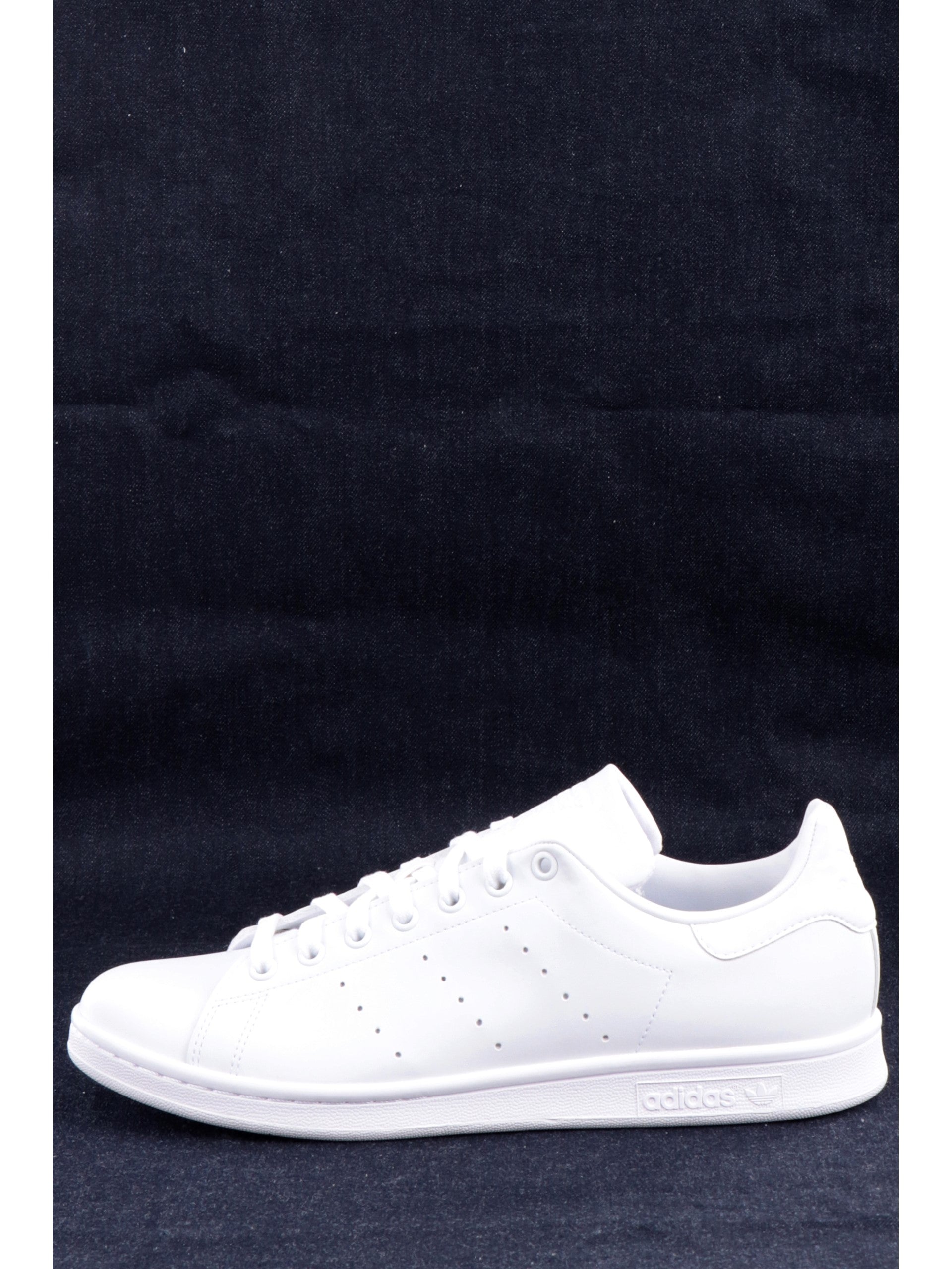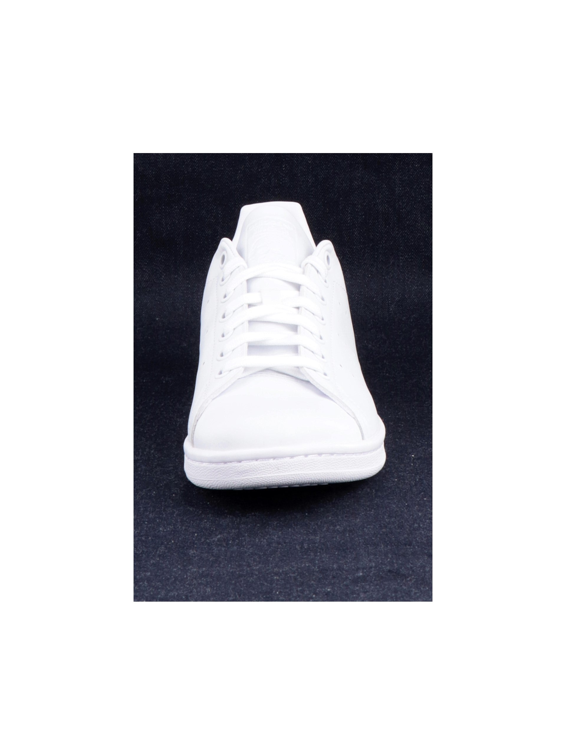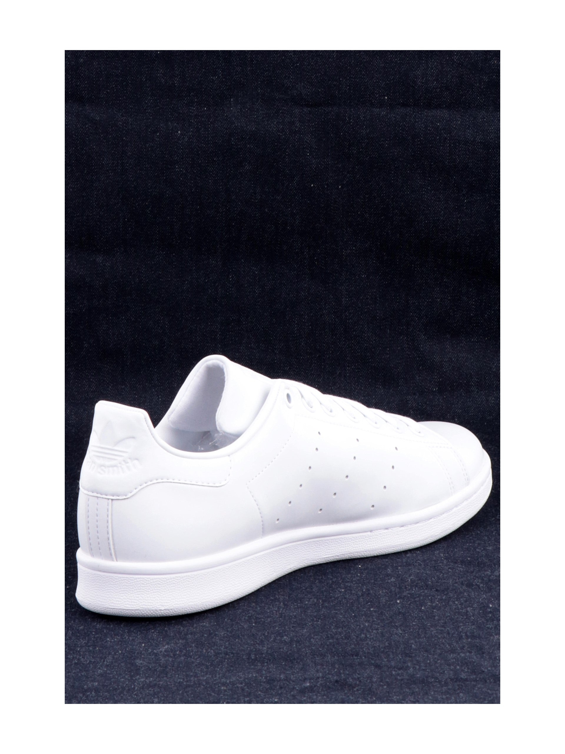 Scarpe Adidas Stan Smith bianche da uomo. Queste scarpe Adidas hanno la tomaia in mesh, la suola in gomma, la classica chiusura a lacci in sintonia di colore e il sottosuola rinforzato con battistrada a pallini. Logo del brand con lettering Stan Smith sopra il tallone.