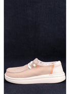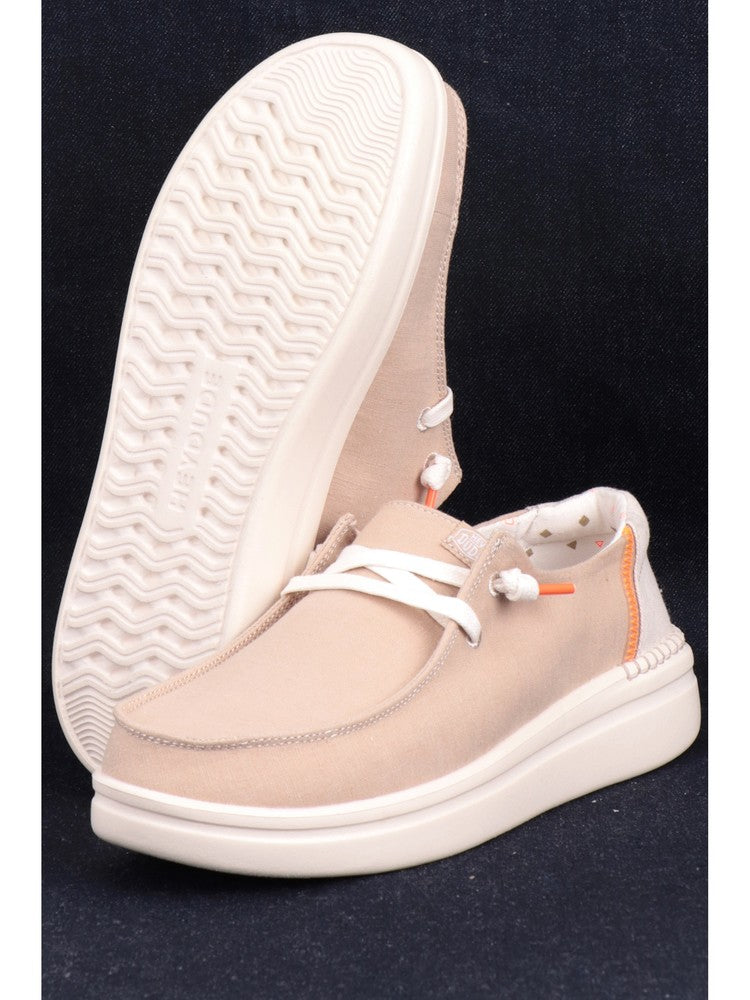 Scarpe Hey Dude beige da donna Wendy Rise. Queste scarpe Hey Dude beige hanno la tomaia in tessuto traspirante, la suola in gomma e la tecnologia Flex&Fold per il massimo comfort. Sul davanti di questi mocassini Hey Dude troviamo la chiusura a lacci e delle morbide cuciture a contrasto colore.