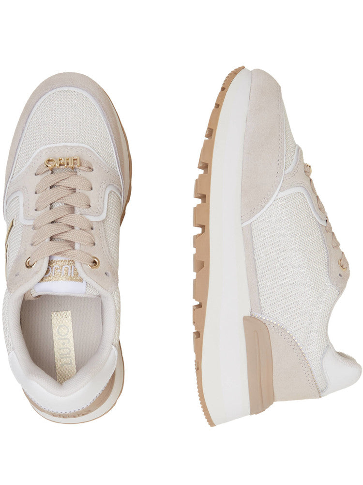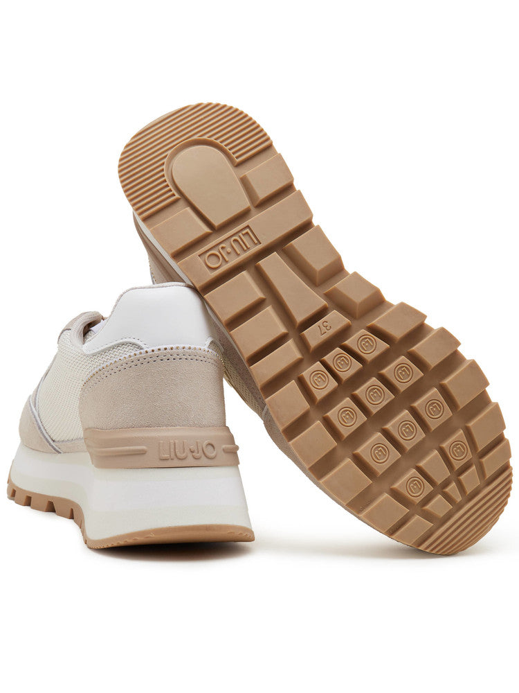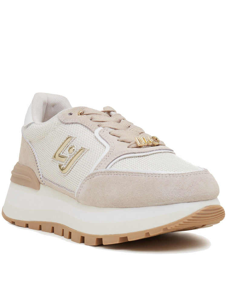 Scarpe Liu Jo Beige da donna Sneaker Amazing 25 BA4005PX380. Queste scarpe Liu Jo beige e bianche hanno la tomaia in tessuto traspirante con glitter all over, il logo cucito a lato laminato, la chiusura con lacci, la suola platform 5 cm in gomma ed il sottosuola con trama antiscivolo.