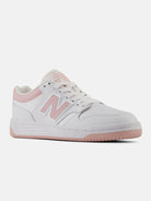 Scarpe New Balance 480 bianche e rosa da bambina Lifestyle GSB480. Queste sneakers New Balance 480 bianche hanno la tomaia in mesh, la suola in gomma e la soletta removibile. Sul davanti di queste 480 troviamo la classica chiusura a lacci, i fori traspiranti e il logo del brand applicato ambo i lati a contrasto colore.