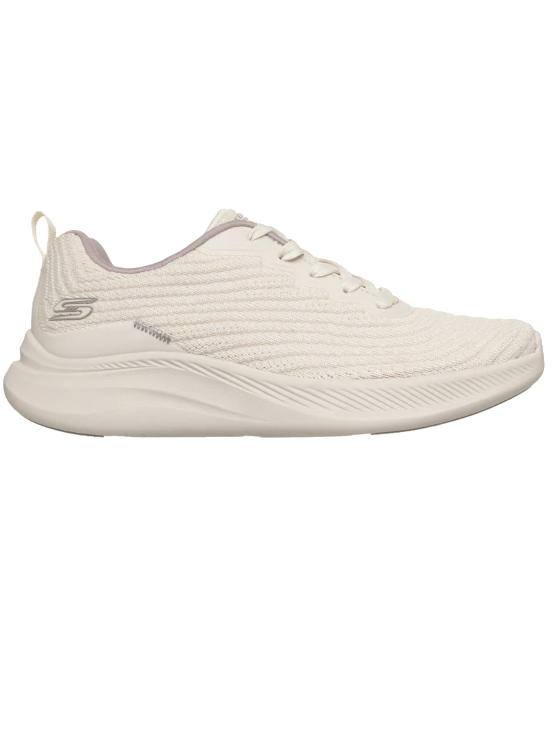Scarpe Skechers bianche Bobs Flex Mellow Dawn da donna Vegan. Queste scarpe Skechers bianche hanno la tomaia in maglia ingegnerizzata testurizzata, la chiusura con lacci, la suola in gomma che garantisce un corretto sostegno dell'arco plantare e una soletta Skechers Air-Cooled Memory Foam.