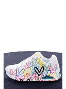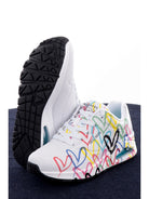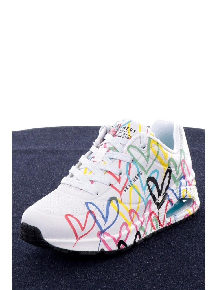 Il writer di fama internazionale James Goldcrown firma con i suoi iconici cuori #Lovewall queste Skechers donna Spread the Love. Soletta comfort Memory Foam®, intersuola con cuscinetto d’aria Skech-Air®, tomaia in duraleather sintetico.