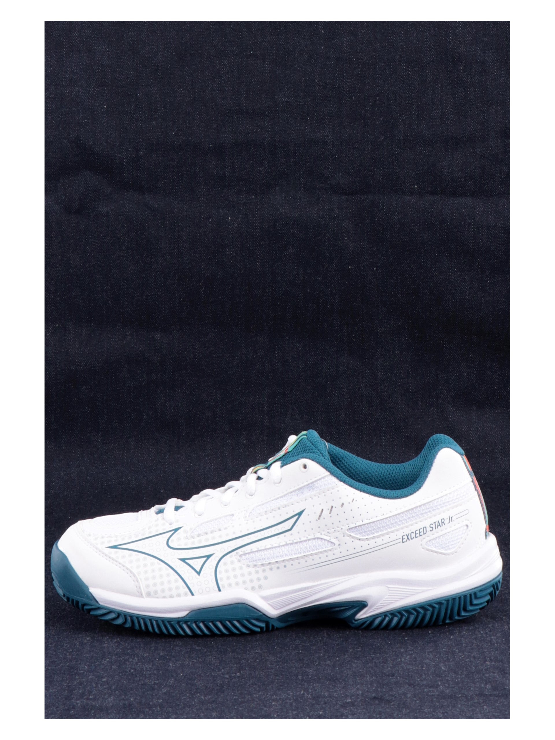 Scarpe Tennis Mizuno bianche e blu da bambino Exceed Star Jr.CC. Queste scarpe Mizuno da tennis hanno la tomaia in tessuto traspirante misto mesh, la suola in gomma e il sottosuola rinforzato con battistrada a lisca di pesce. Sul davanti troviamo la classica chiusura a lacci, il logo del brand su entrambi i lati a contrasto colore e il lettering 'Exceed Star Jr'.