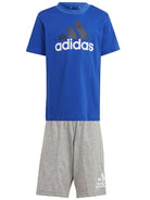 Set Adidas blu e grigio da bambino IS24. La t-shirt di questo set Adidas ha le maniche corte, il fondo regolare e la maxi stampa del brand sul davanti a contrasto colore. I pantaloncini di questo setAdidas hanno la banda elastica sul punto vita regolabile con laccetti e il logo del brand applicato sul fondo a contrasto colore.