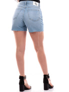 Shorts Calvin Klein da donna Mom J20J222803, realizzati in 100% puro cotone. Questi pantaloncini Calvin Klein blu hanno la chiusura con bottone logato più zip, due tasche laterali aperte (una con taschino), due tasche posteriori a filo e il fondo strappato con frange.
