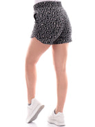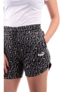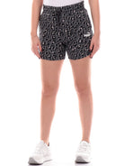 Shorts Puma grigi da donna animalier 677928, realizzati in morbido cotone. Questi pantaloncini Puma grigi hanno la banda elastica sul punto vita regolabile con laccetti, due tasche laterali aperte e la fantasia animalier all over a contrasto colore.