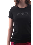 T-Shirt da trekking CMP nera da donna 39T5676P. Questa maglietta CMP nera da trekking girocollo ha le maniche corte, il fondo regolare e la stampa del brand applicata sul davanti a contrasto colore.