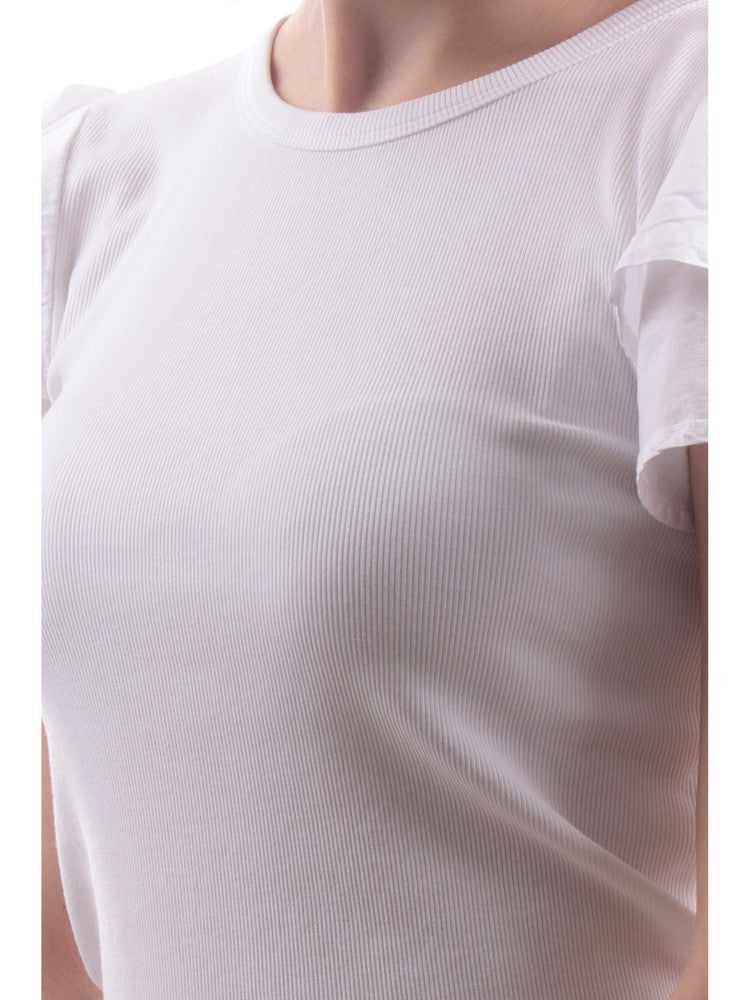 T-shirt Deha bianca da donna rifinita in costina con girocollo e manica corta a balze con volants in popeline tinta unita. Il modello D63472 dalla vestibilità asciutta, appartiene alla linea Deha Hype e offre un design sfizioso, ma sempre confortevole, per accompagnarti in ogni moento della tua giornata!