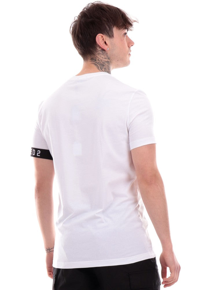 T-shirt Dsquared bianca da uomo banda logata D9M3S5400, realizzata in morbido cotone. Questa maglia Dsquared bianca girocollo ha le maniche corte, il fondo regolare e una banda elastica logata sulla manica sinistra a contrasto colore.