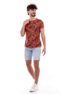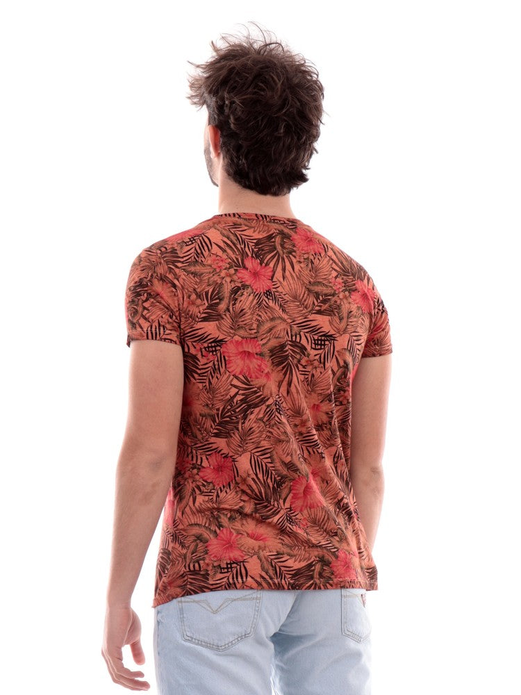 T-shirt Fifty Four arancione da uomo con stampa estiva, modello UDALLT396, realizzata in 100% puro cotone. Questa maglia Fifty Four arancione ha le maniche corte, il logo del brand sul cuore a contrasto colore e la fantasia floreale all over.