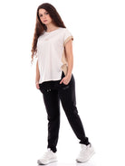 La nostra modella è alta 1,74 mt e indossa maglie taglia S e pantaloni taglia 42.