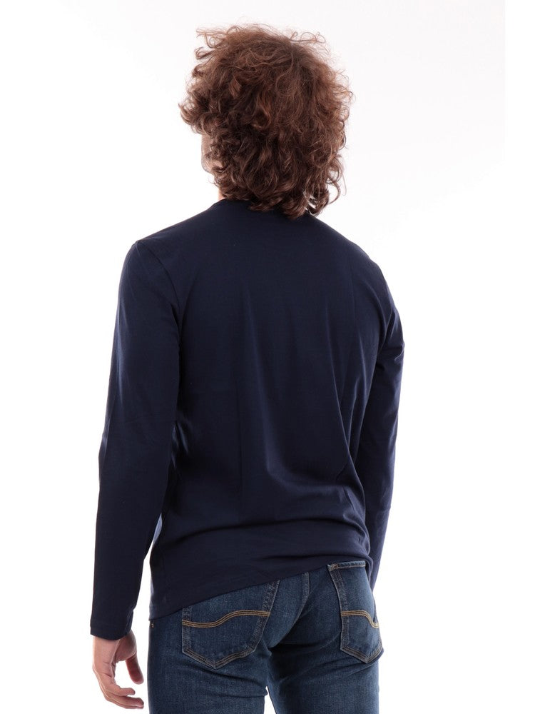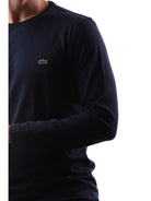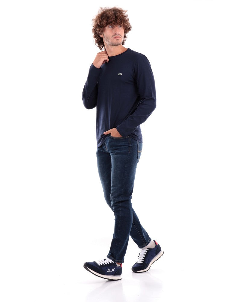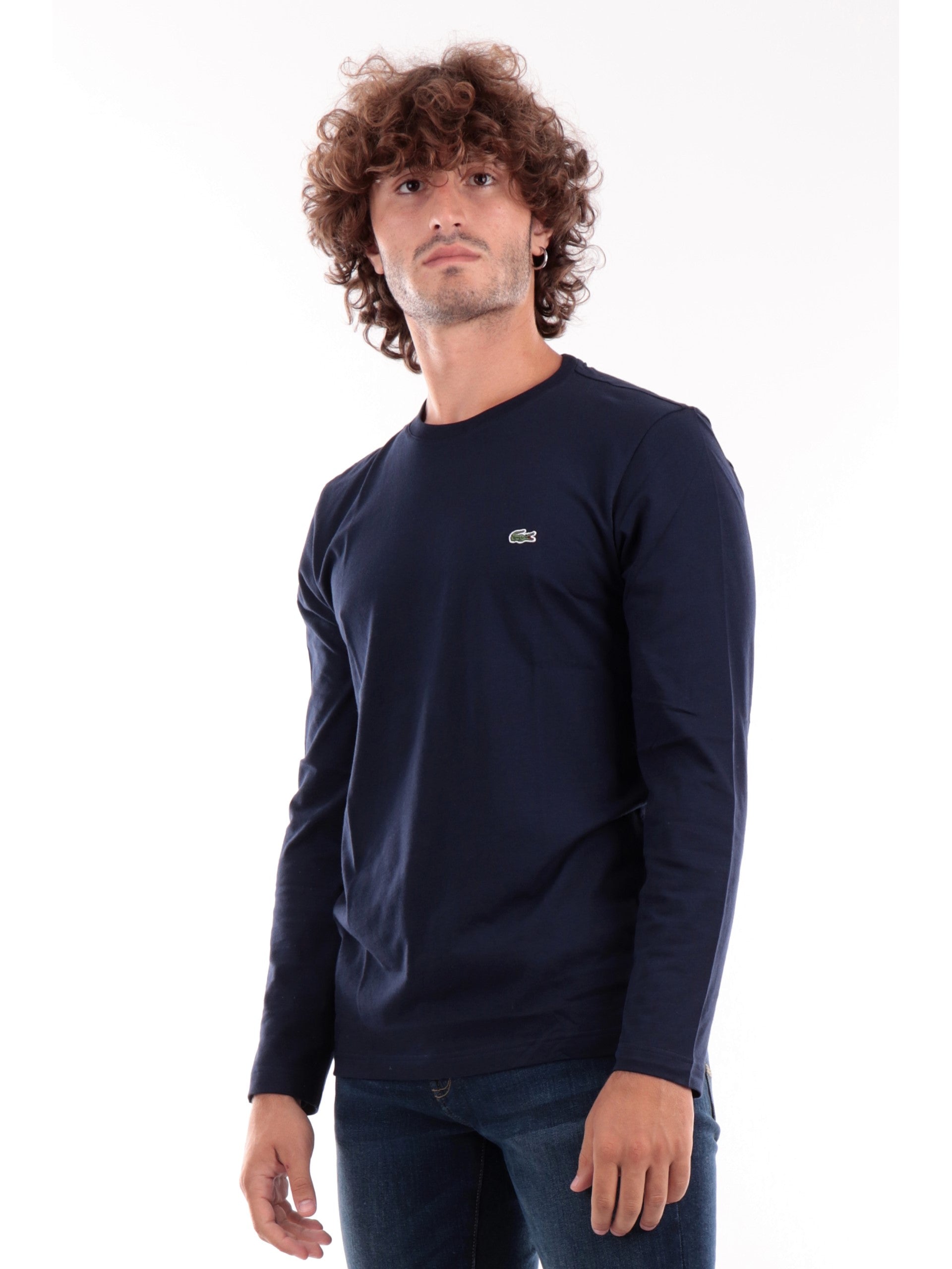 Maglia Lacoste blu da uomo. Questa T-Shirt Lacoste blu girocollo ha le maniche lunghe, l'iconico coccodrillo ricamato sul davanti lato sinistro, il fondo regolare e la composizione 100% cotone.
