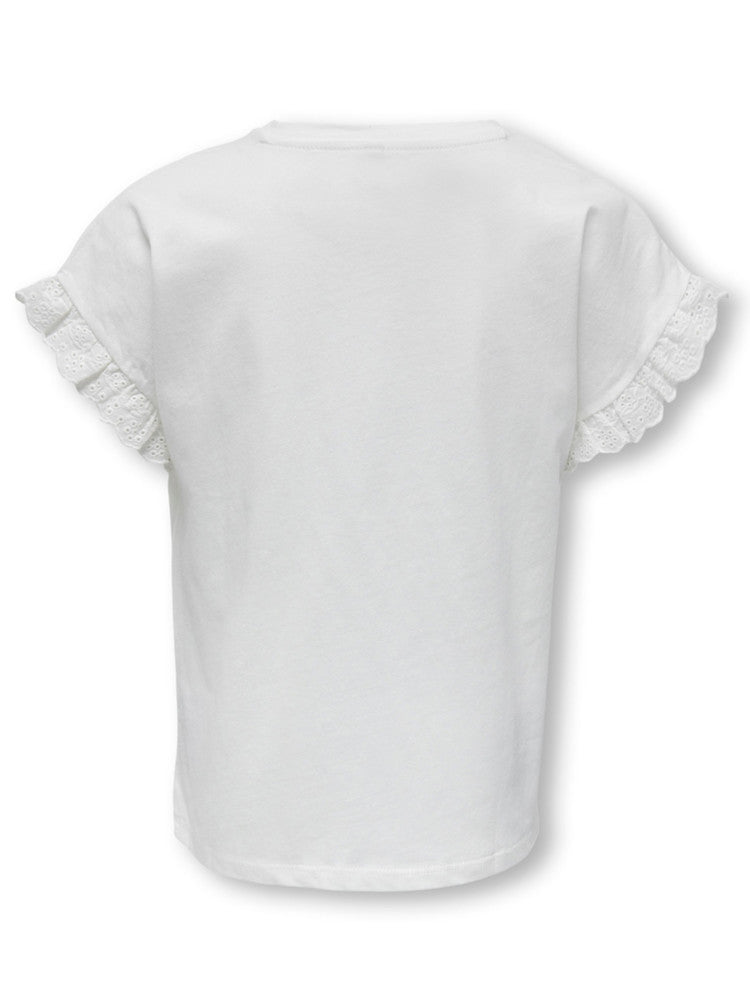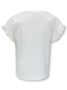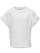 T-shirt Only bianca da bambina 15285384, realizzata in 100% puro cotone. Questa maglia Only bianca ha il girocollo, le maniche con balze e il fondo regolare.