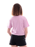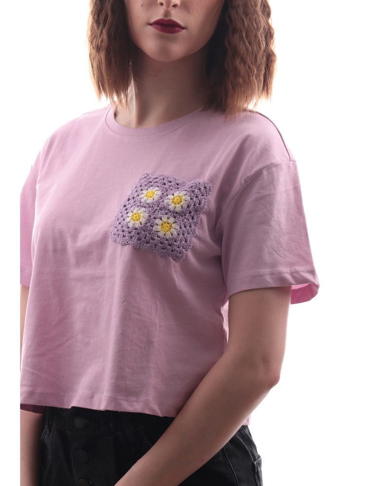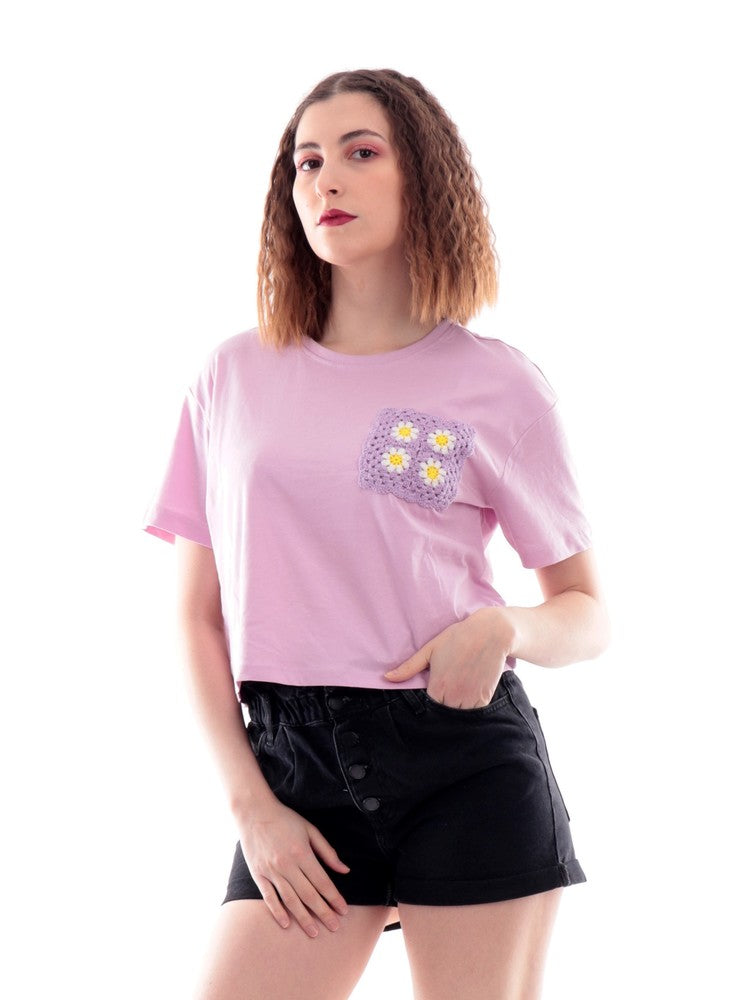 T-shirt Only lilla da donna realizzata in jersey di cotone morbido e leggero, proposta in tonalità tinta unita. Maglia maniche corte dal fit ampio e comodo, dal taglio crop. Il modello 15257452 è caratterizzato dal taschino in tono a toppa sul petto, applicato in tessuto all'uncinetto rifinito con margherite ricamate a contrasto colore.
