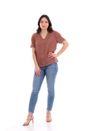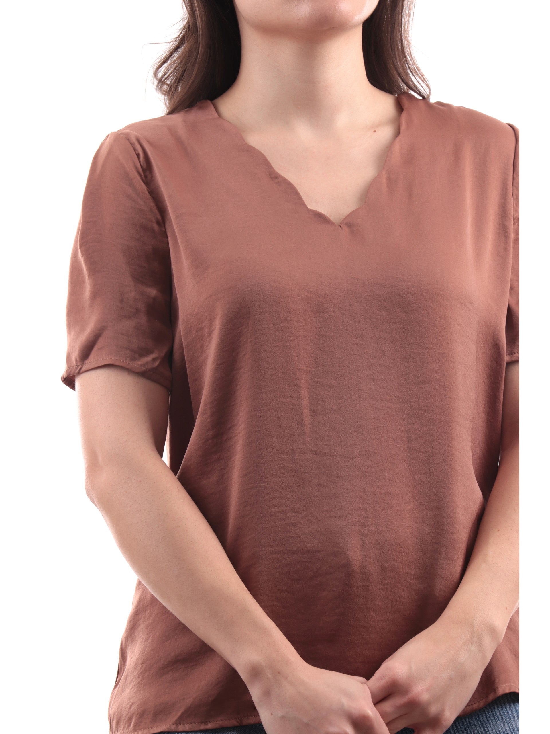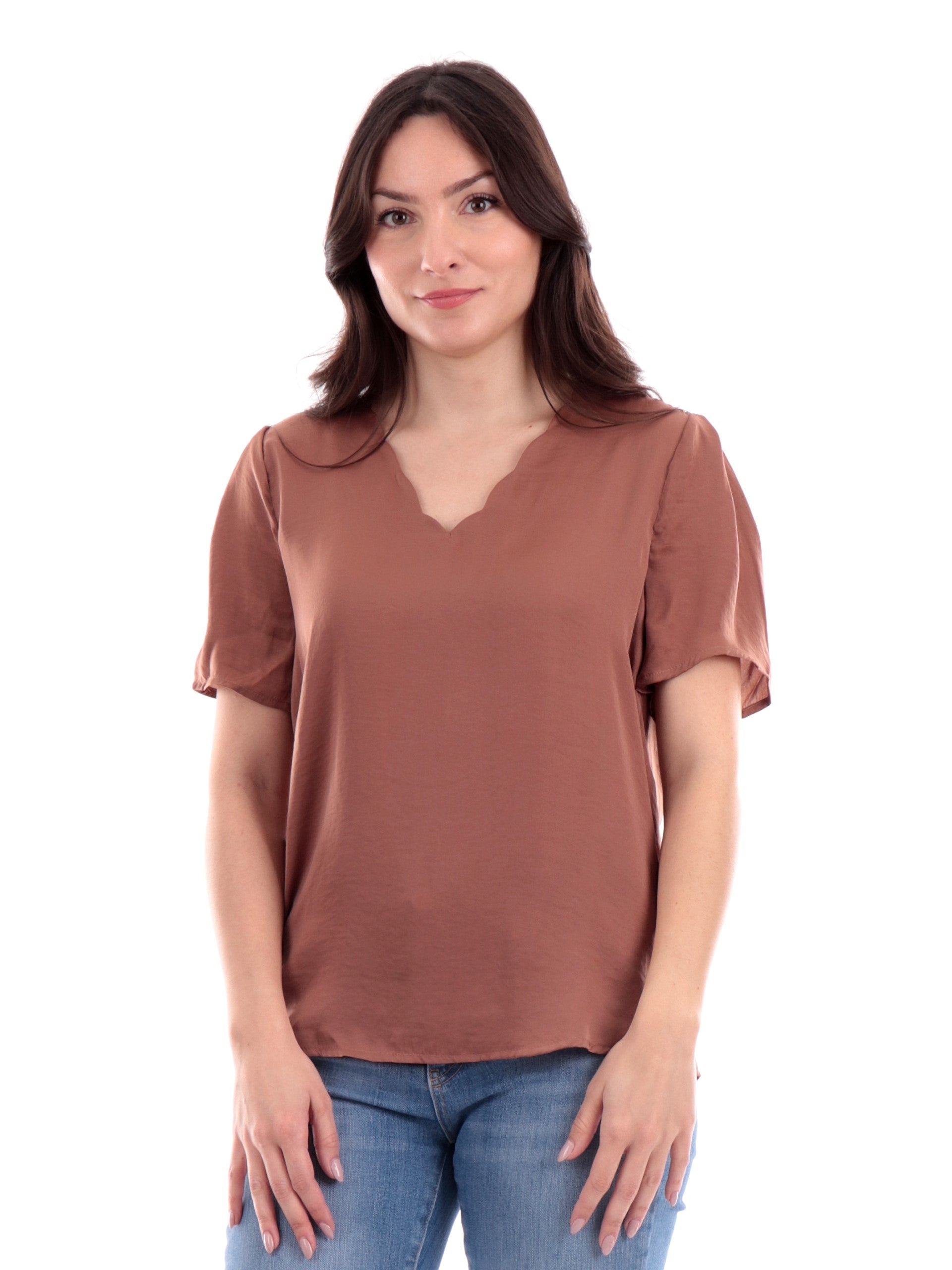 T-Shirt Only marrone da donna V-Neck Top Wvn 15288127. Questa maglietta Only marrone ha lo scollo a V ondlato, le maniche corte ed il fondo asimmetrico.