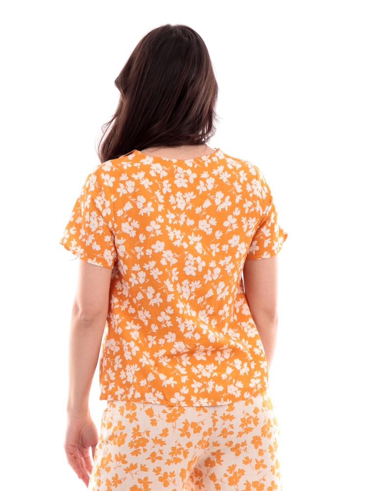 T-shirt Tiffosi arancione da donna con scollo, modello Daffodil 10049373. Questa maglia Tiffosi arancione ha lo scollo a V, le maniche corte, la fantasia con fiori all over a contrasto colore e il davanti elasticizzato regolabile con laccetti.