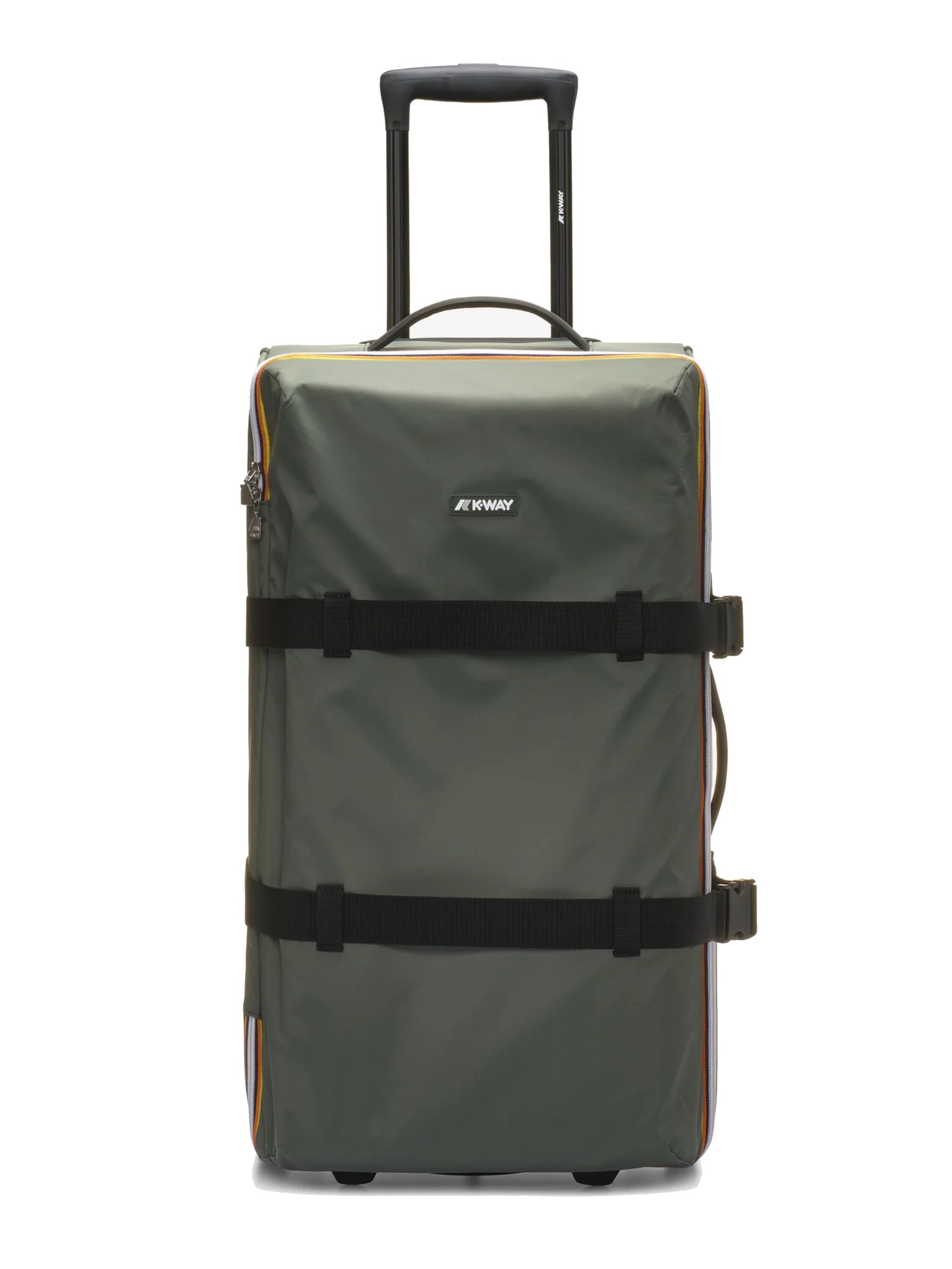 Valigia grande trolley K-Way verde Blossac. Questa valigia da viaggio, realizzata dal tessuto ripstop impermeabile, idrorepellente, antivento, è caratterizzato da due ruote, tasche funzionali per organizzare il contenuto, scompartimenti multifunzionali interni, bustina di riconoscimento agganciabile, manico rigido estraibile da tasca posteriore, manico superiore e laterale per la massima versatilità e chiusura con zip a doppio cursore.