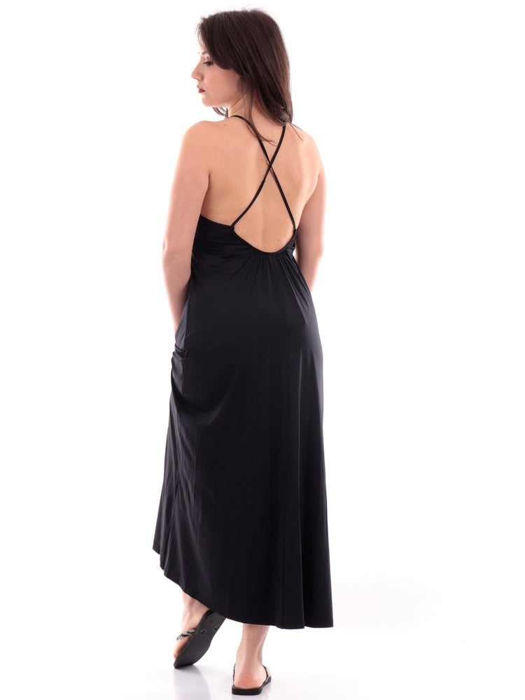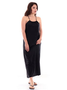 Vestito 4Giveness da donna nero. Questo abito 4Giveness da donna è lungo fino ai piedi ed ha una vestibilità scivolata. Molto particolare l'intreccio delle bretelline sottili dietro alla schiena che lo rendono seducente.