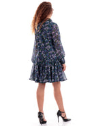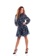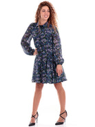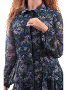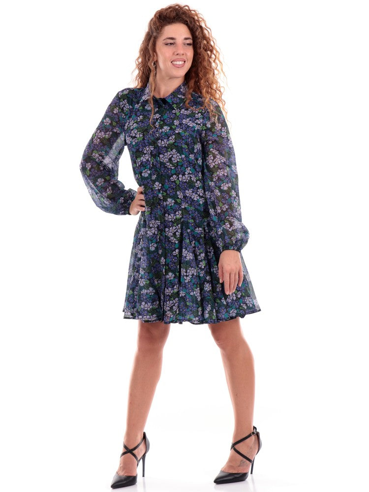 Vestito Molly Bracken viola da donna Woven RS105BH, realizzato con inserti in tessuto chiffon. Questo vestito Molly viola ha il colletto tradizionale, la chiusura con patta a bottoni, le maniche lunghe con polsini, il fondo svasato e la fantasia floreale all over a contrasto colore.